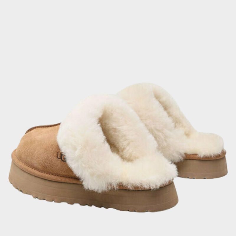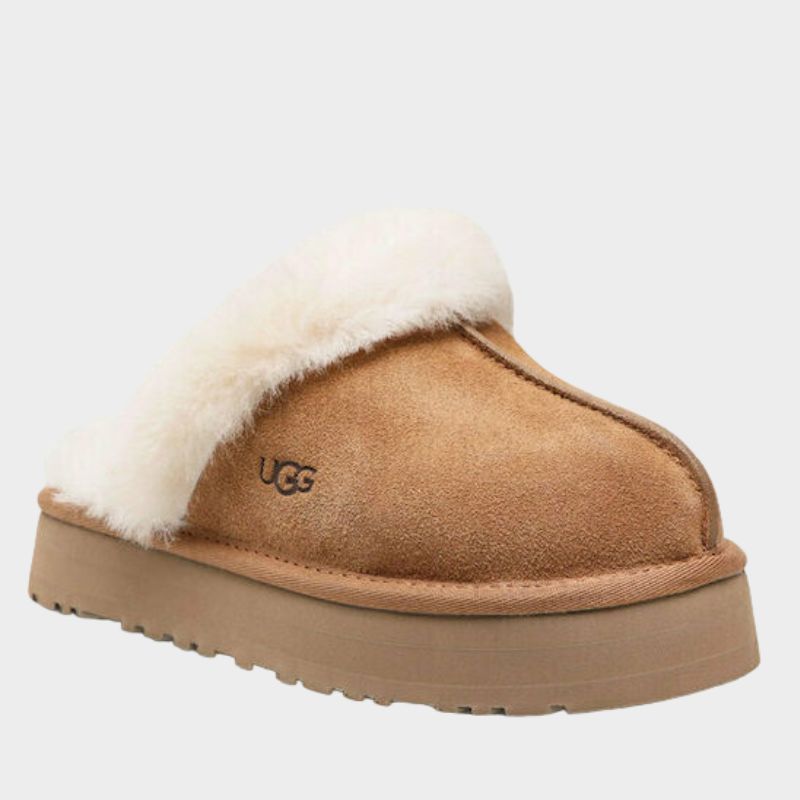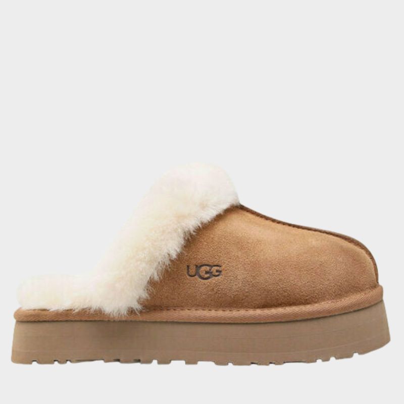 Το Disquette συνδυάζει μια ρετρό πλατφόρμα με μια κλασική slip-on σιλουέτα, προσφέροντας άνεση όλης της ημέρας και μια μαξιμαλιστική εμφάνιση. Κατασκευασμένο από υπογραφή suede και δέρμα προβάτου, ενσωματώνει καινοτόμες εξωτερικές σόλες, όπως EVA από ζαχαροκάλαμο, που μειώνει την εξάρτηση από τα ορυκτά καύσιμα, Treadlite της UGG™, που προέρχεται από εργοστάσιο που ενισχύει τις γυναίκες μέσω του HERproject. Με επένδυση και σόλα από δέρμα προβάτου 1 cm, ενδιάμεση σόλα EVA και κλωστοϋφαντουργικό δέσιμο από 100% ανακυκλωμένες ίνες πολυεστέρα, το Disquette ολοκληρώνεται με υφαντή ετικέτα και ανάγλυφο λογότυπο UGG® στην εσωτερική σόλα.