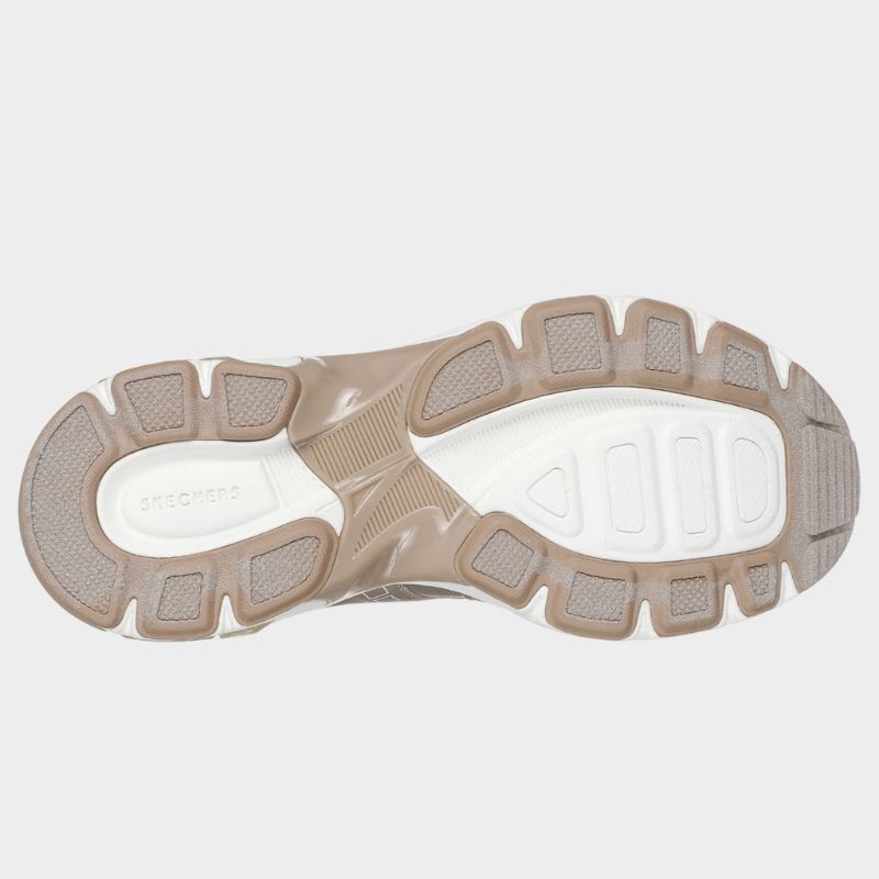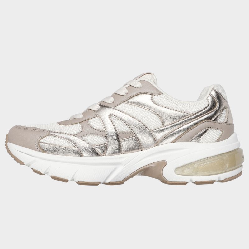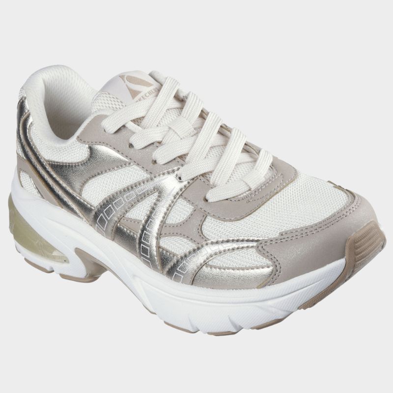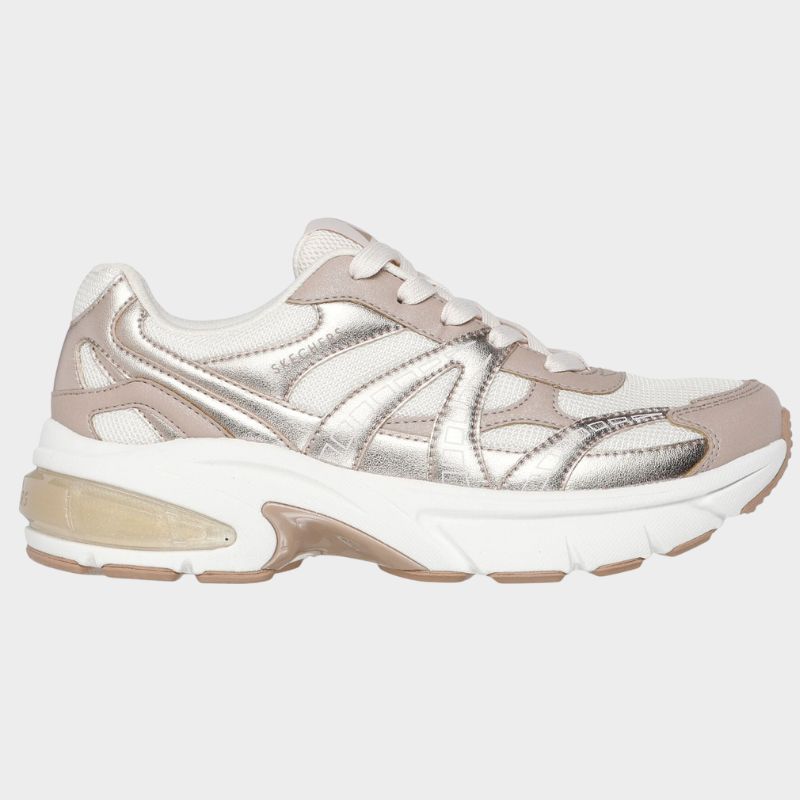 Αυτό το μοντέρνο sneaker με κορδόνια διαθέτει μεταλλικό δερμάτινο και διχτυωτό επάνω μέρος με ημιδιαφανές ένθετο ενδιάμεσης σόλας και προστατευμένη σόλα Skechers Air-Cooled Memory Foam®.
