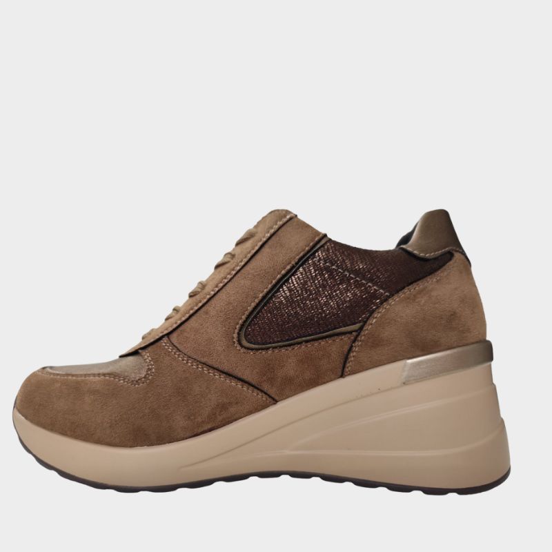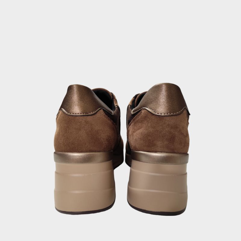 Sneaker της Adam’s shoes με άνω μέρος από οικολογικό δέρμα σε μπρονζε χρώμα. Διαθέτει μαλακό εσωτερικό πάτο και εξωτερική σόλα από καουτσούκ. Διαθέτουν κορδόνια και πλαινό φερμουάρ.