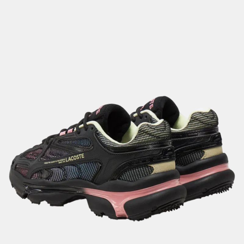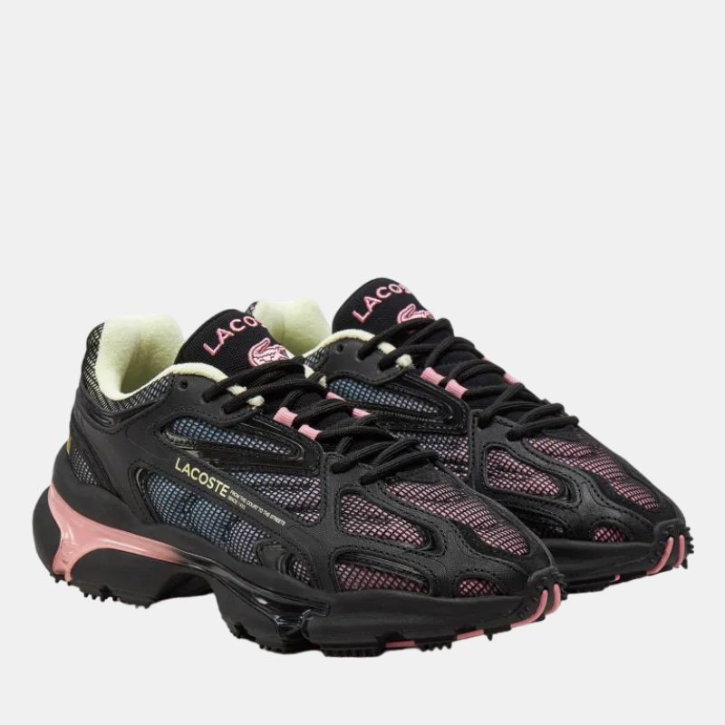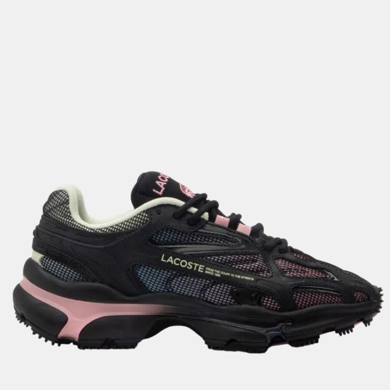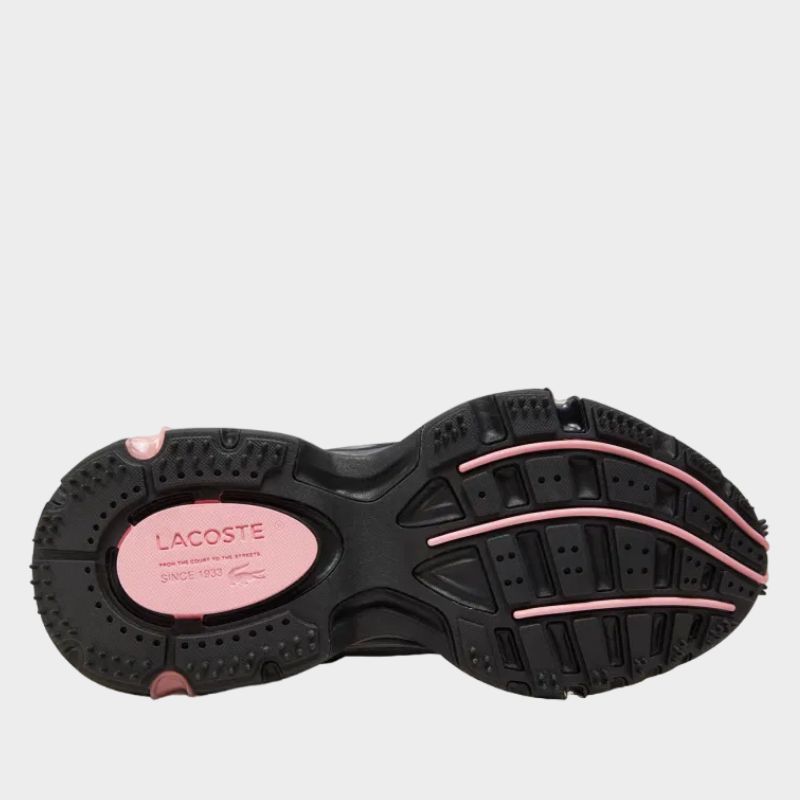 Lacoste Sneaker διατίθενται σε μαύρο χρώμα με ροζ λεπτομέρειες. Το εξωτερικό υλικό αποτελείται από φυσικό βουρτσισμένο δέρμα, συνδυασμένο με οικολογικό δέρματος και υλικό από ύφασμα με πλέγμα. Η εσωτερική επένδυση είναι επίσης κατασκευασμένη από συνδυασμό υλικών, προσφέροντας άνεση και ανθεκτικότητα. Η σόλα είναι φτιαγμένη από EVA και καουτσούκ, προσφέροντας σταθερότητα και καλή απορρόφηση κραδασμών.
