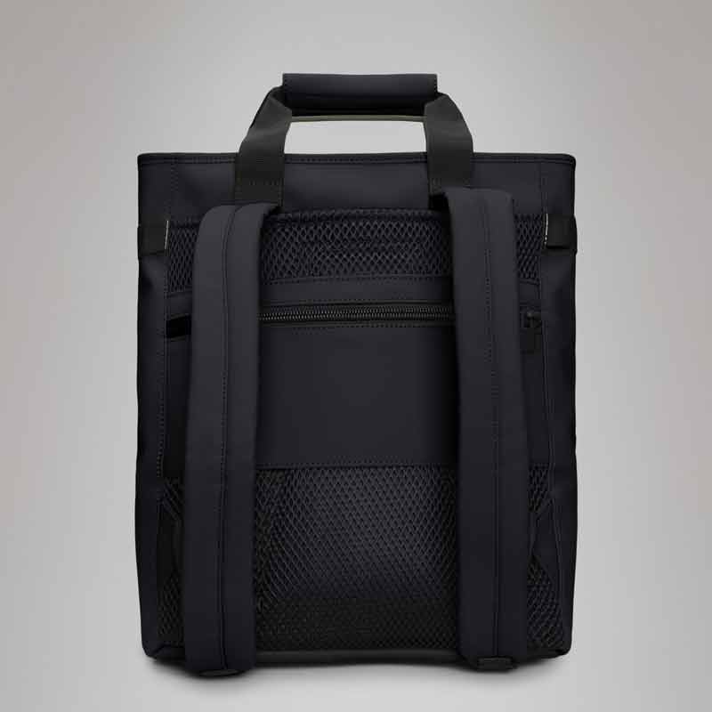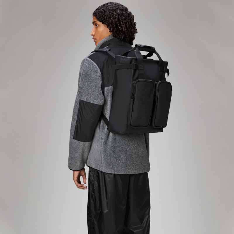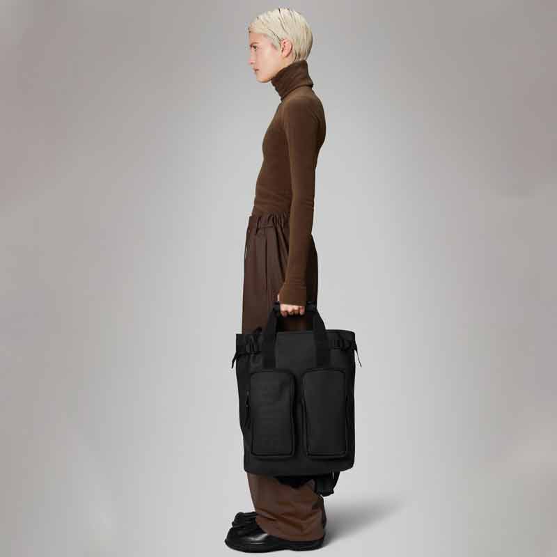 Το σακίδιο πλάτης Texel Tote είναι μια υβριδική τσάντα για μικρά ταξίδια, με επένδυση για φορητό υπολογιστή και κατασκευασμένη από αδιάβροχο ύφασμα PU. Λειτουργεί τόσο ως αδιάβροχο τσαντάκι όσο και ως σακίδιο πλάτης με επενδυμένα λουριά. Διαθέτει ευρύχωρη κύρια θήκη με πλέγμα και τσέπες με φερμουάρ, κατάλληλη για φορητούς υπολογιστές 15 ιντσών. Εξωτερικά, έχει δύο μπροστινές τσέπες για μικροαντικείμενα, λαβές μεταφοράς, πλευρικούς ιμάντες συμπίεσης και μανίκι τρόλεϊ για εύκολη μεταφορά. Κατασκευασμένη από ανθεκτικό και απαλό αδιάβροχο ύφασμα PU της Rains.