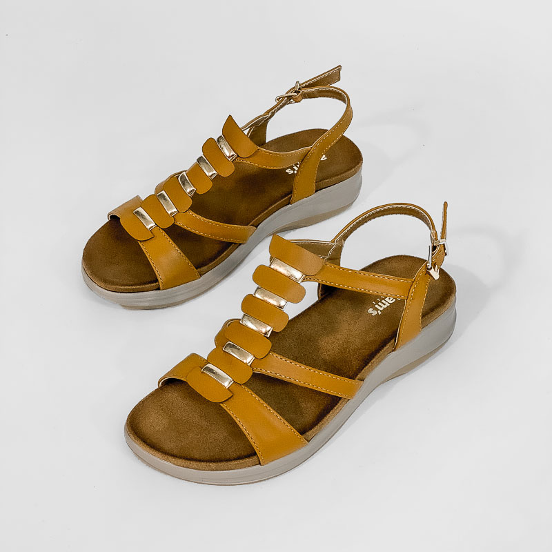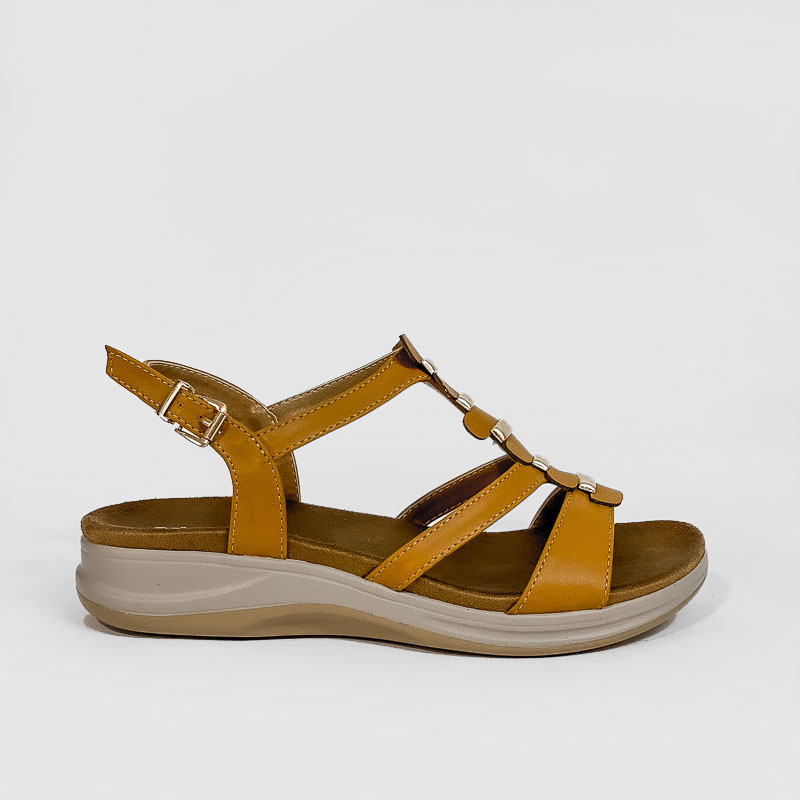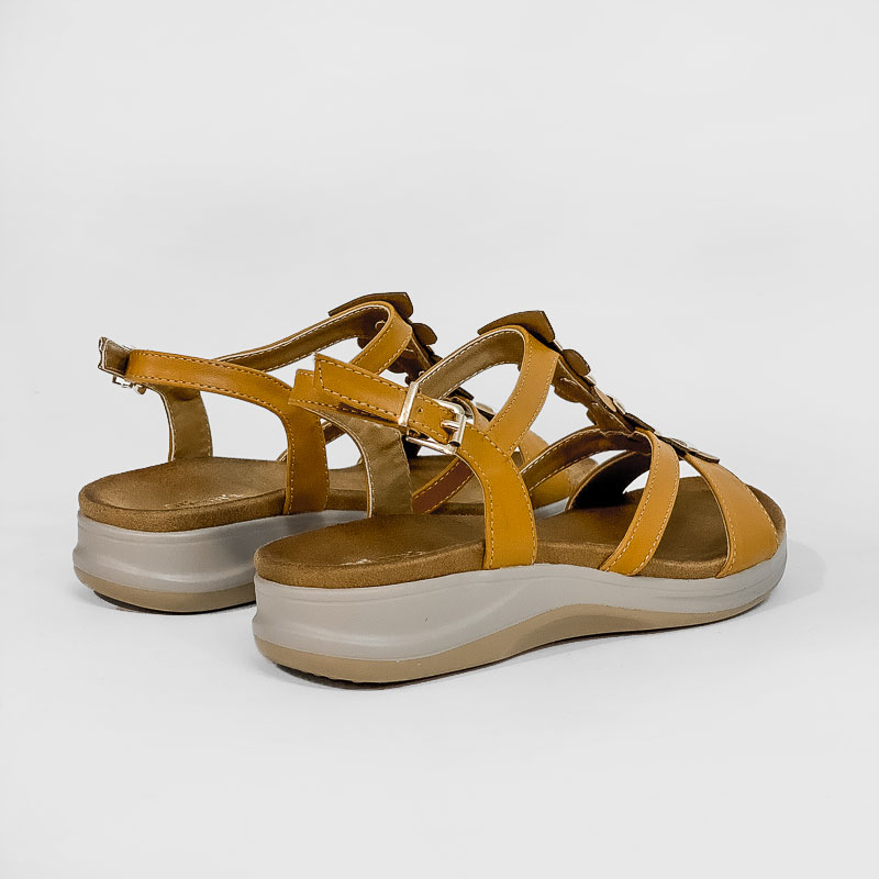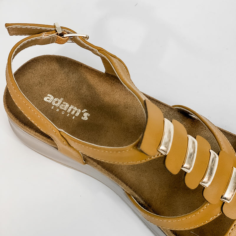 Ανατομική σανδάλι της Adam’s από οικολογικό δέρμα σε ταμπά χρώμα που κλείνει με λουράκι. Διαθέτει μαλακό πάτο κάνοντας το βήμα σας ελαφρού και άνετο κ. Επιπλέον διαθέτει χρυσές μεταλλικές λεπτομέρειες για εντυπωσιακές εξόδους.