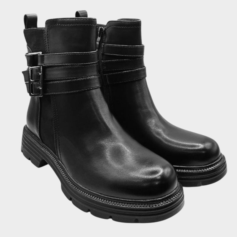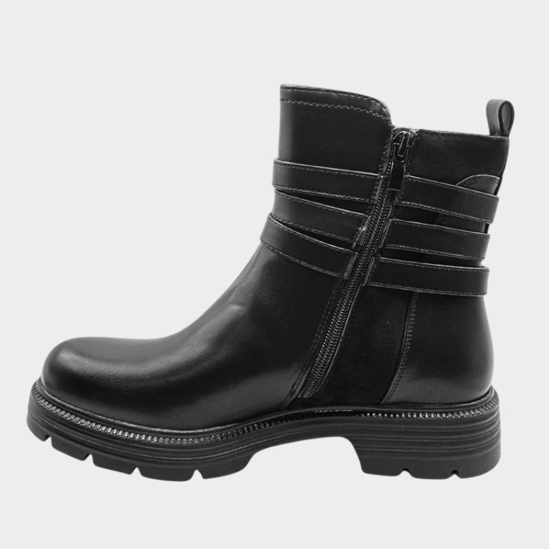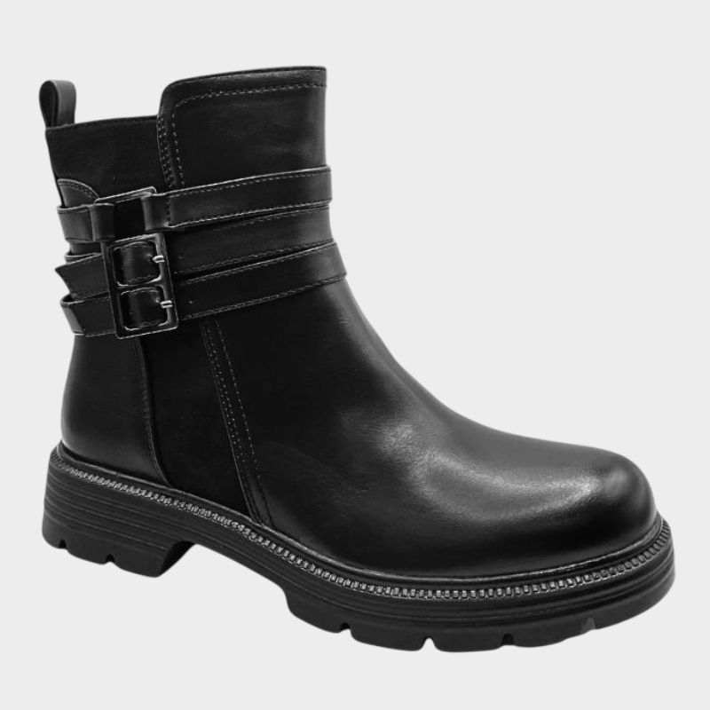 Κομψά και μοντέρνα γυναικεία μποτάκια σε μαύρο χρώμα, ιδανικά για όλες τις ώρες της ημέρας. Με στρογγυλή μύτη, χοντρή αντιολισθητική σόλα και διακοσμητικές αγκράφες στο πλάι, αποτελούν μια στυλάτη και πρακτική επιλογή για το φθινόπωρο και τον χειμώνα.