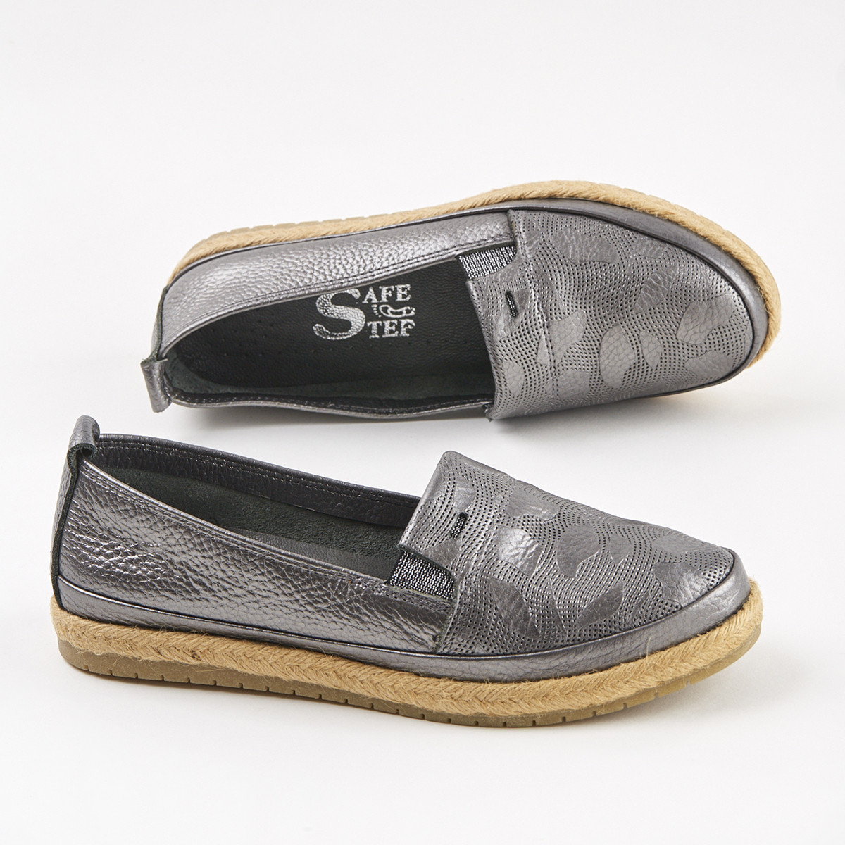 Ανατομική εσπαντρίγια από γνήσιο δέρμα σε ασημί χρώμα. Διαθέτει δερμάτινο εσωτερικό πάτο και εξωτερική σόλα από υλικό υψηλής ποιότητας,