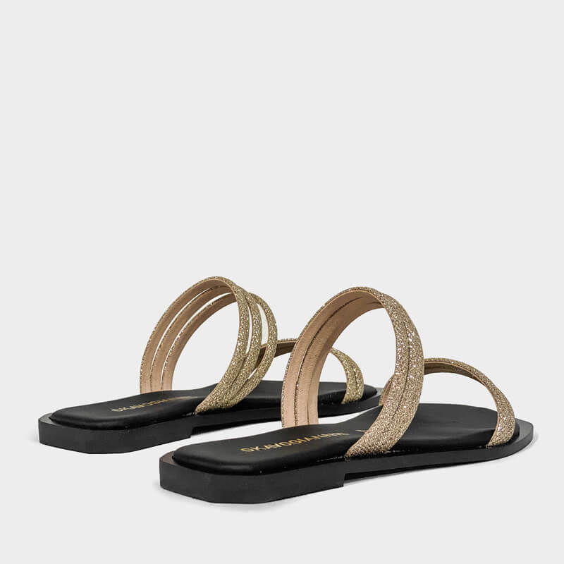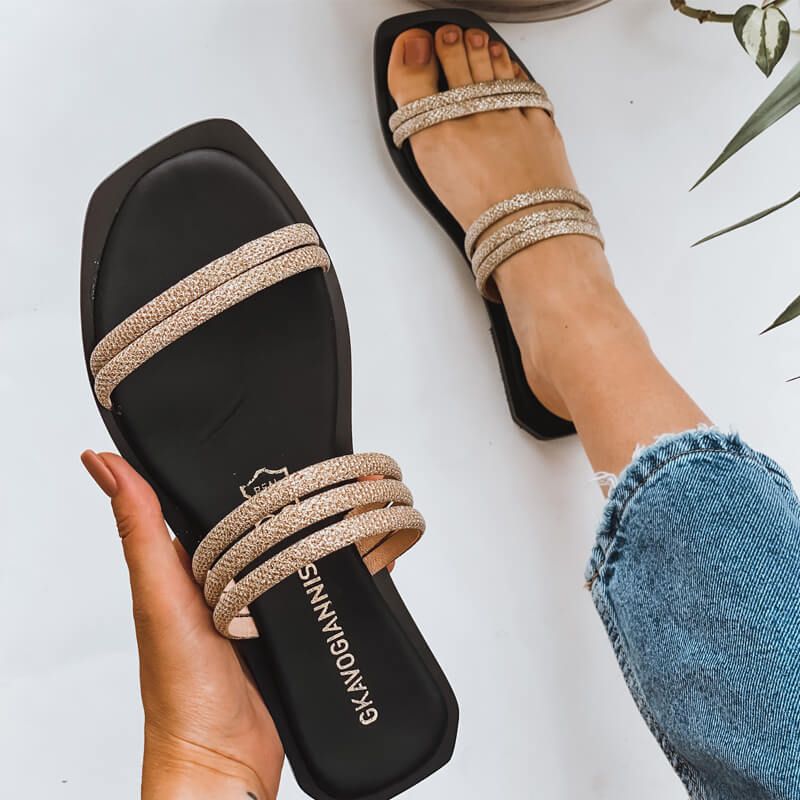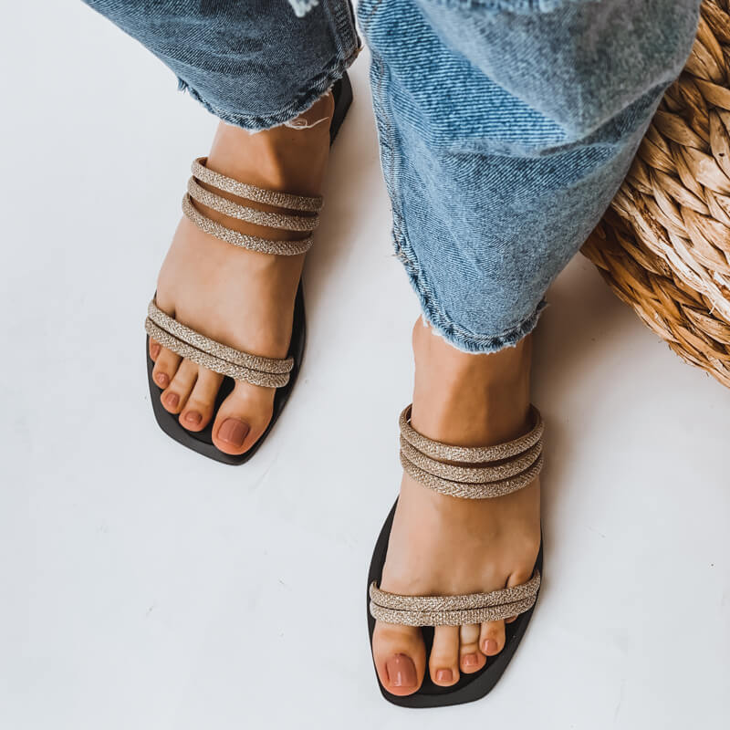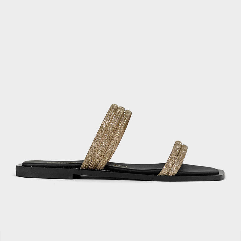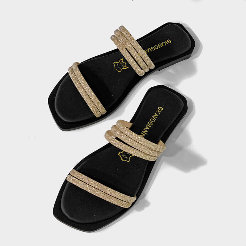 Γυναικεία παντόφλα Ελληνικής κατασκευής χειροποίητη, από γνήσιο δέρμα εξαιρετικής ποιότητας. Διαθέτει λεπτά λουράκια με χρυσές λεπτομέρειες που προσδίδουν λάμψη στο look σας. Ο ανατομικός αφρώδης πάτος προσδίδει άνεση για ανάλαφρα βήματα όλη μέρα. Ένα άκρως εντυπωσιακό και στιλάτο  γυναικείο πέδιλο για κάθε περίσταση που θα απογειώσει το στυλ σας.