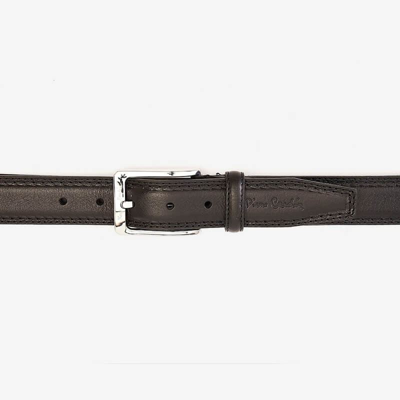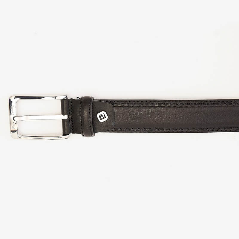 Δερμάτινη ζώνη Pierre Cardin από γνήσιο δέρμα σε μαύρο χρώμα. Το σχέδιο ολοκληρώνεται με τετράγωνη αγκράφα και μεταλλικό λογότυπο της εταιρίας.