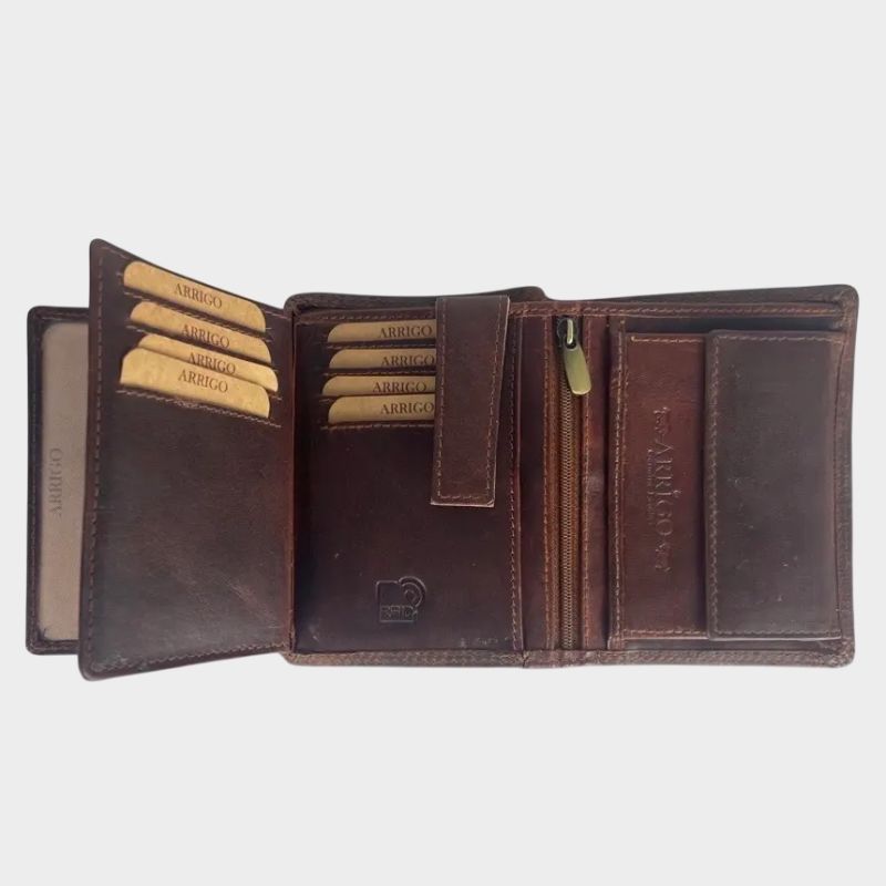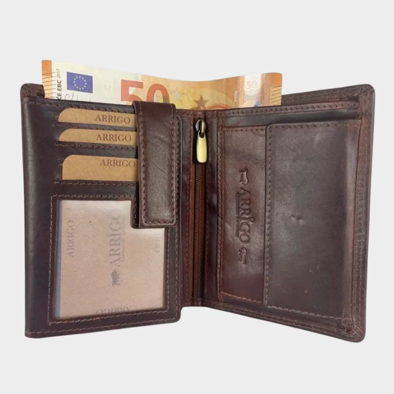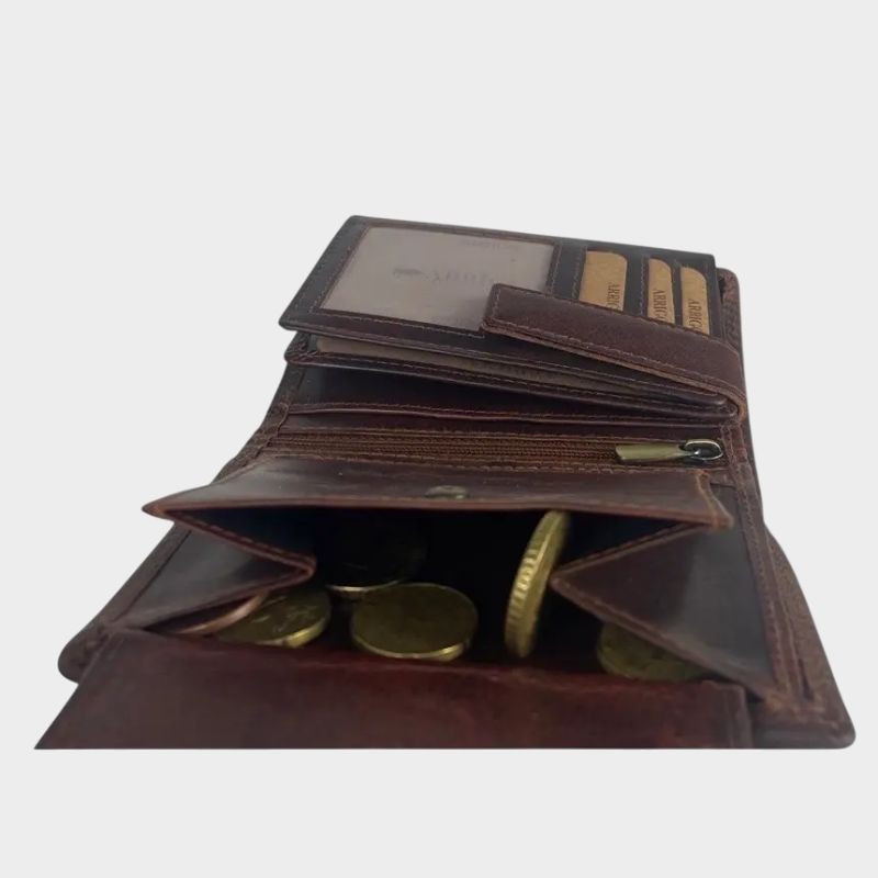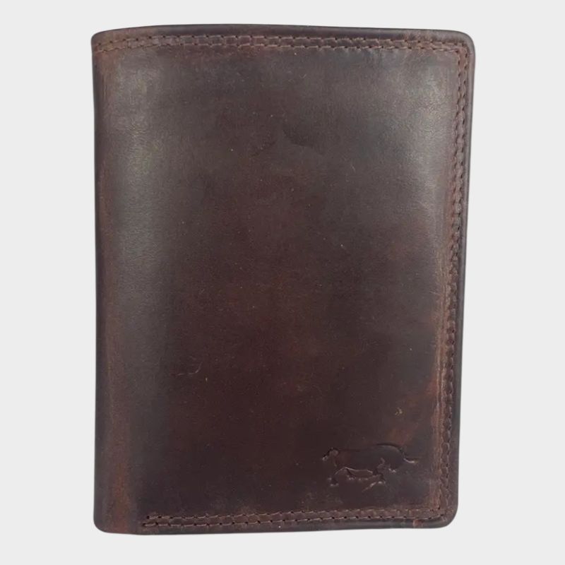 Ένα καλαίσθητο πορτοφόλι τύπου billfold, σε όρθια διάταξη, κατασκευασμένο από υψηλής ποιότητας εύκαμπτο δέρμα αγελάδας με oil-finish. Συνδυάζει λειτουργικότητα, ασφάλεια και κομψό design, καθιστώντας το ιδανικό για καθημερινή χρήση.