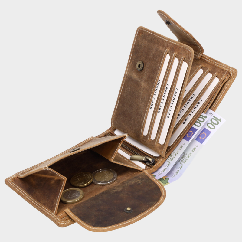 Διαστάσεις: 12 x 9,5 x 2 cm Υλικό: Γνήσιο δέρμα 6 υποδοχές πιστωτικών καρτών Θήκη νομισμάτων 1 θήκη με φερμουάρ 2 θήκες για χαρτονομίσματα 3 τσέπες
