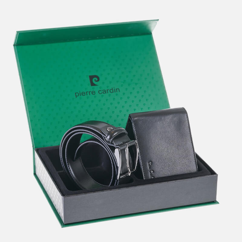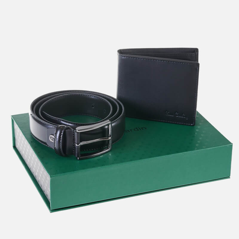 Σετ δώρου Pierre Cardin που αποτελείτε από δερμάτινο πορτοφόλι και δερμάτινη ζώνη με αγκράφα.
