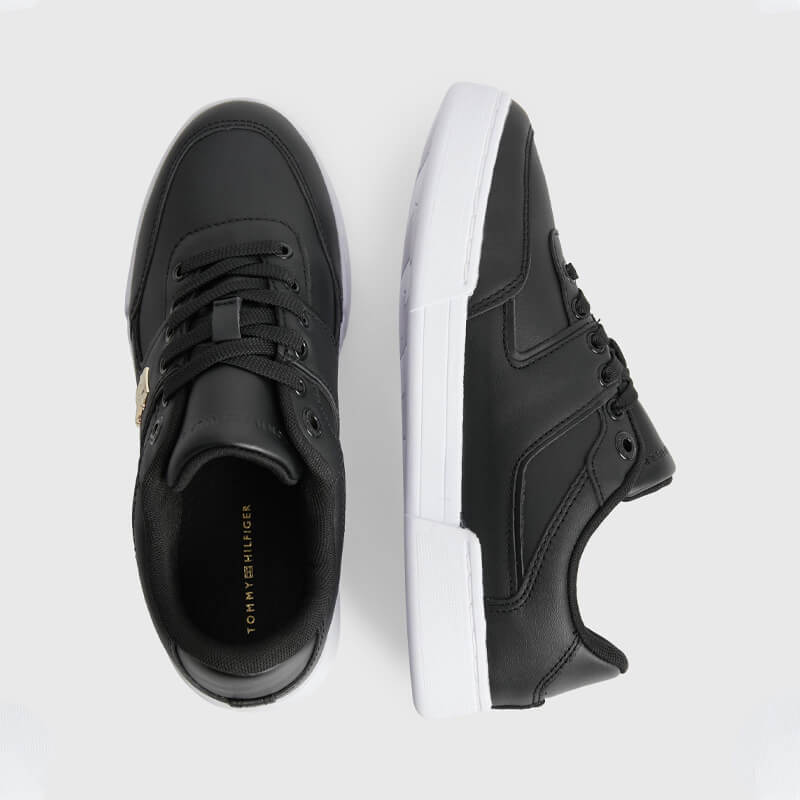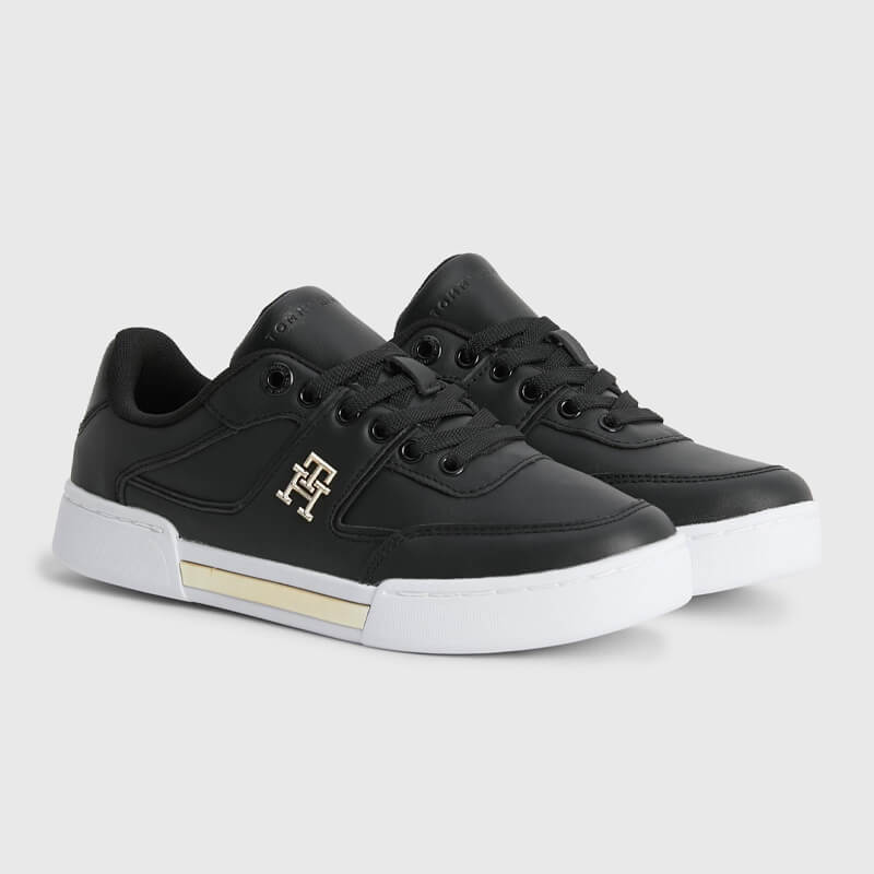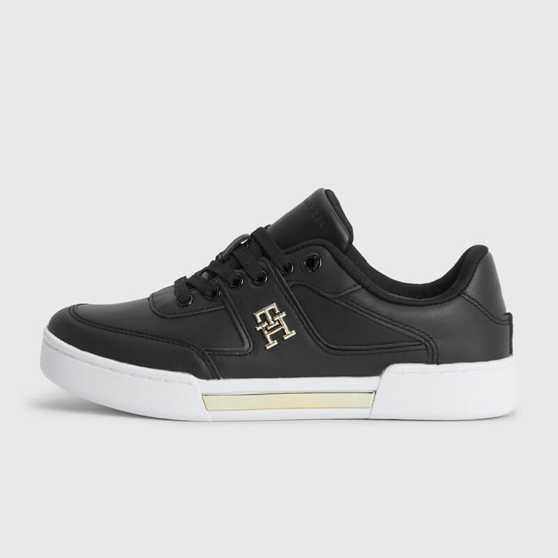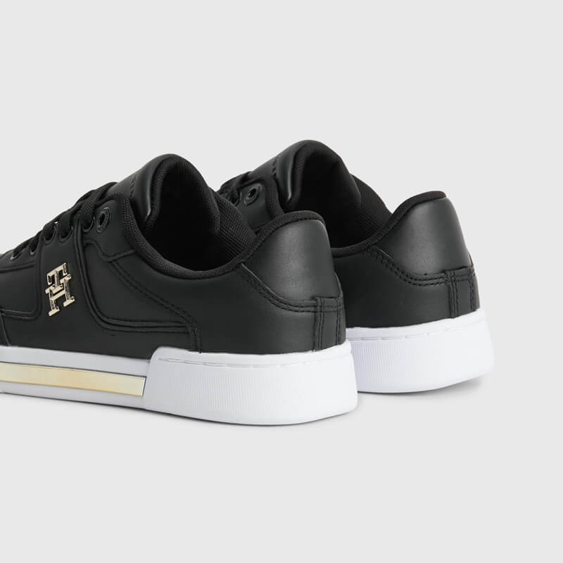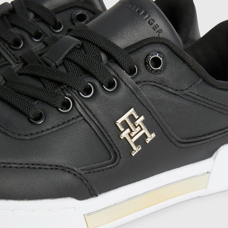 Δερμάτινο sneaker Tommy Hilfiger με άνω μέρος από γνήσιο δέρμα σε μαύρο χρώμα. Διαθέτει πάτο από ανακυκλωμένο θερμοπλαστικό καουτσούκ και και σόλα από καουτσούκ. Ένα κομψό παπούτσι με χρυσές λεπτομέρειες που θα σας προσφέρει άνεση και στυλ.