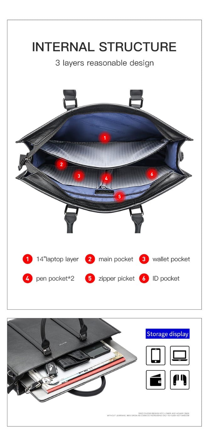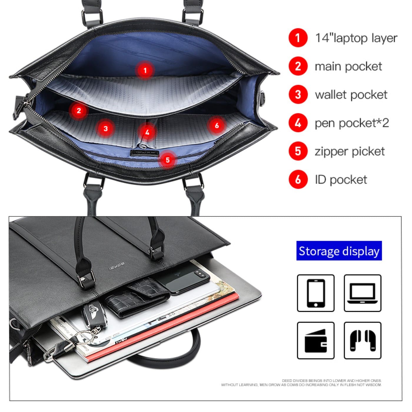 -ΓΝΗΣΙΟ ΔΕΡΜΑ– Κατασκευασμένο από πλούσιο, πλήρες δέρμα Κολομβίας με ευρύχωρο, πλήρως επενδεδυμένο εσωτερικό. Φορτωμένο με χαρακτηριστικά, όπως μια τσέπη για φορητό υπολογιστή με επένδυση που χωράει τους περισσότερους φορητούς υπολογιστές με οθόνη έως 14 ιντσών, τσέπη προστασίας RFID.