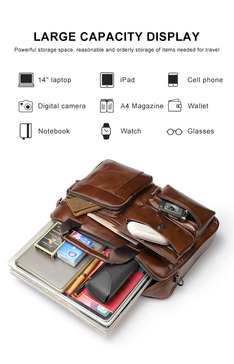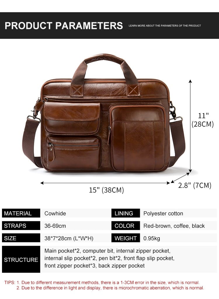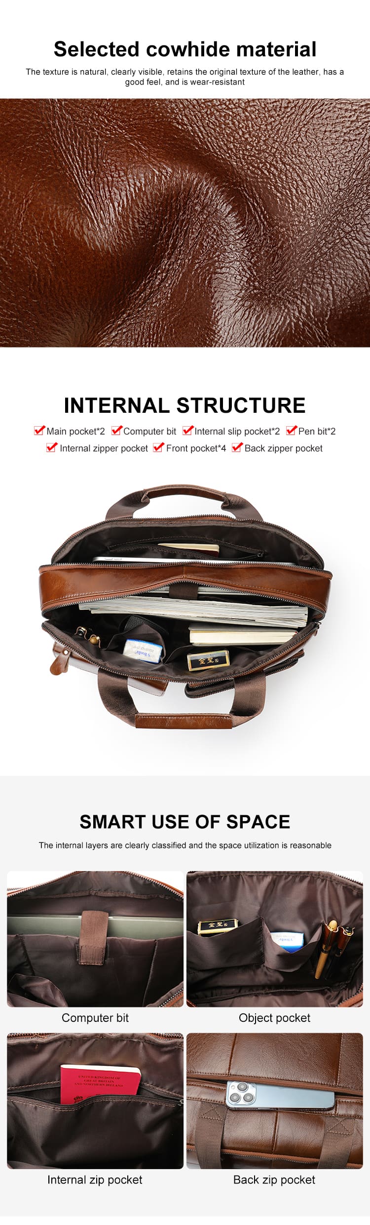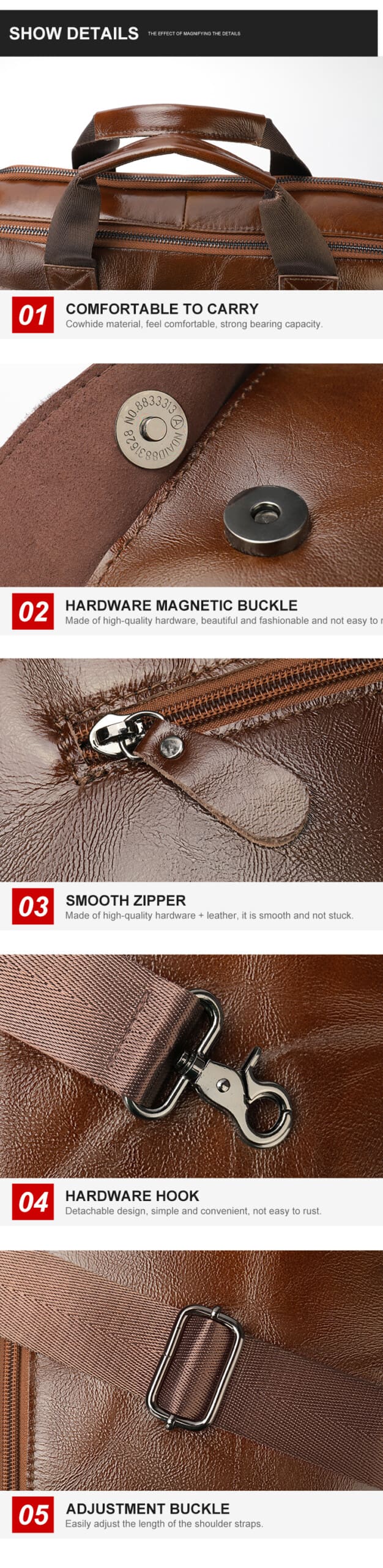 – Αυτός ο χαρτοφύλακας είναι κατασκευασμένος από υψηλής ποιότητας γνήσιο δέρμα ειδικής επεξεργασίας διετούς παλαίωσης. Αυτό το δέρμα έχει υποστεί μια ειδική διαδικασία για να του δώσει ένα μοναδικό και αυθεντικό στυλ, με εμφανείς σημάδια παλαίωσης. Η τσάντα είναι μοντέρνα και ευέλικτη, μπορεί να φορεθεί ως χιαστί τσάντα, τσάντα ώμου ή δερμάτινη μονοθέσια τσάντα με χειρολαβή.