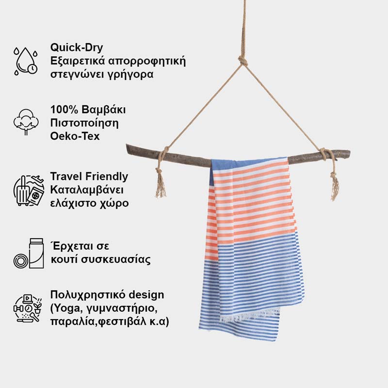 Eλαφριά Πετσέτα Θαλάσσης Quick-Dry Towel To Go Bali TTG3TM (180 x 100 cm) Μπλε-Πορτοκαλί