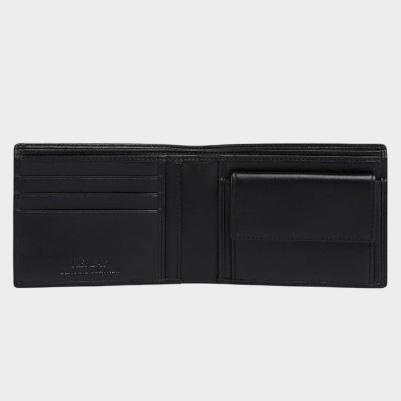 Tρεις θέσεις καρτών από τη μία πλευρά και μια τσέπη νομισμάτων με καπάκι από την άλλη.