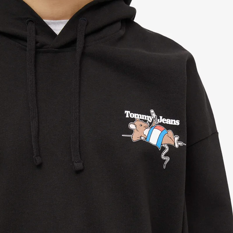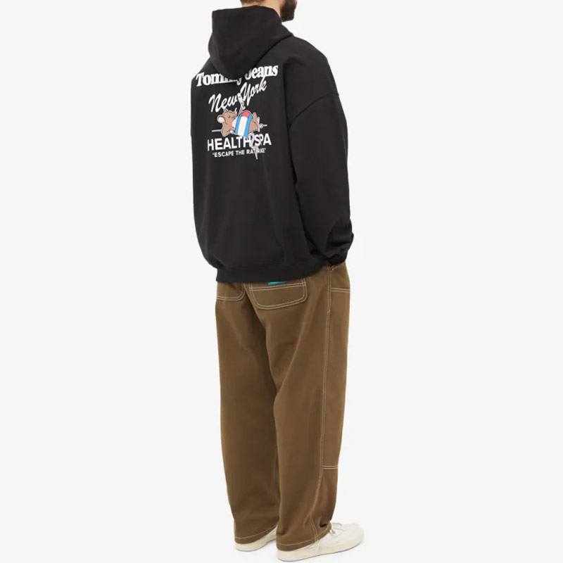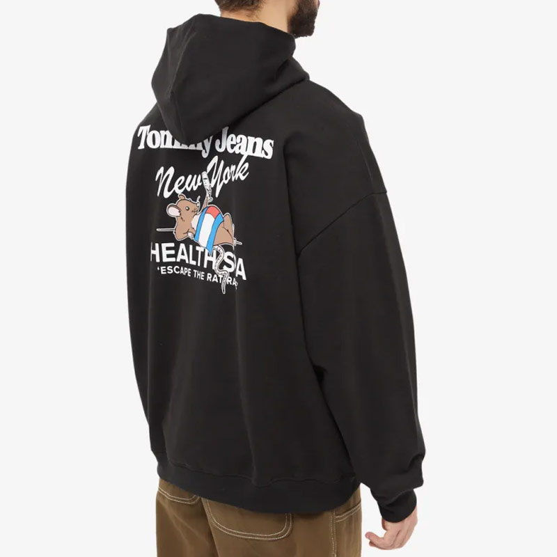 Σύνθεση: 100% βαμβάκι Χρώμα: Μαύρο Εφαρμογή: Oversized Κουκούλα με κορδόνι Τυπωμένα γραφικά στο πίσω μέρος