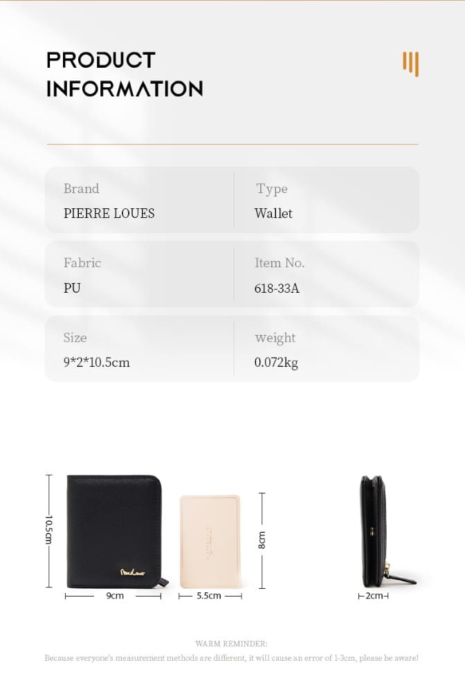 – Χαρακτηριστικά – Το γυναικείο πορτοφόλι Pierre Loues clutch διαθέτει ένα ελαφρύ σχέδιο, κλασικό και κομψό. Το κλείσιμο με φερμουάρ μπορεί να προστατεύσει τα προσωπικά σας αντικείμενα.