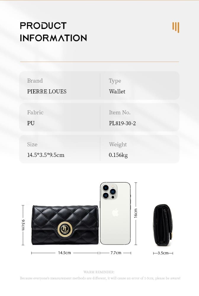 – Χαρακτηριστικά – Το γυναικείο πορτοφόλι Pierre Loues clutch διαθέτει ένα ελαφρύ σχέδιο, κλασικό και κομψό. Προστατεύσει τα προσωπικά σας αντικείμενα.