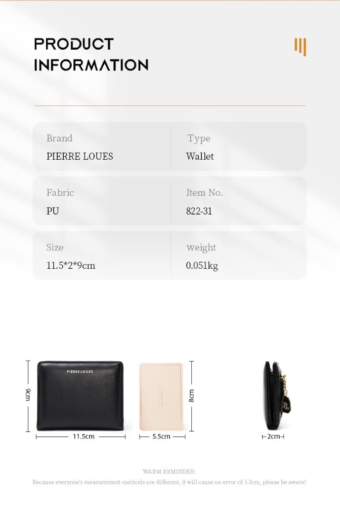 – Χαρακτηριστικά – Το γυναικείο πορτοφόλι Pierre Loues clutch διαθέτει ένα ελαφρύ σχέδιο, κλασικό και κομψό. Το κλείσιμο με φερμουάρ μπορεί να προστατεύσει τα προσωπικά σας αντικείμενα.