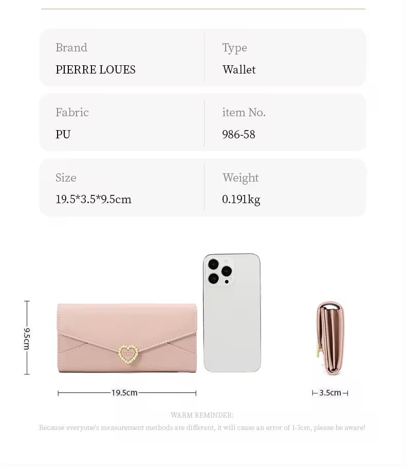 – Χαρακτηριστικά – Το γυναικείο πορτοφόλι Pierre Loues clutch διαθέτει ένα ελαφρύ σχέδιο, κλασικό και κομψό. Προστατεύσει τα προσωπικά σας αντικείμενα.