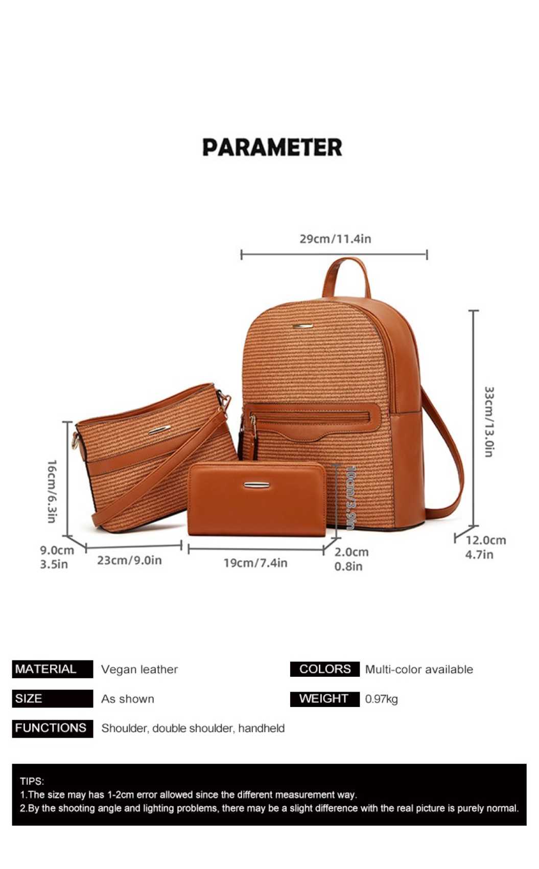 !!ΠΡΟΣΟΧΗ!!(Το χρώμα κάθε προϊόντος είναι αυτό που απεικονίζεται στην φωτογραφία προφίλ , οι υπόλοιπες φωτογραφίες που ακολουθούν είναι για να αντιληφθεί ο πελάτης τις λεπτομέρειες του προϊόντος) Το γυναικείο σετ τσαντών 3 τεμαχίων περιλαμβάνει σακίδιο πλάτης, τσάντα χειρός και πορτοφόλι σε κομψές μπεζ-μαύρο αποχρώσεις. Κατασκευασμένο από vegan leather και ανθεκτικό ύφασμα, προσφέρει πρακτικότητα, αντοχή και στυλ για κάθε περίσταση.
