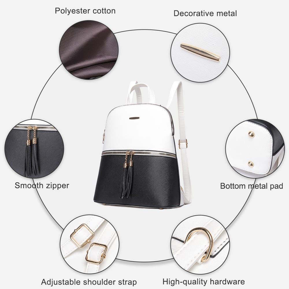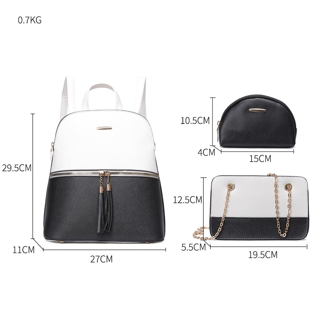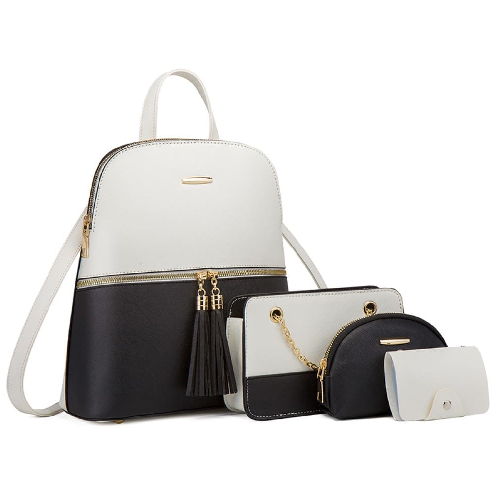 -Γυναικείο Σετ-: Το σακίδιο πλάτης έχει μια κύρια θήκη με μία εσωτερική τσέπη με φερμουάρ . Το γυναικείο σετ 4 τεμαχίων περιλαμβάνει ένα σακίδιο πλάτης, τσάντα χιαστί μεσαίου μήκους και ένα νεσεσέρ .Το σακίδιο πλάτης μπορεί να χωρέσει το iPad, το πορτοφόλι, τα μακιγιάζ, το τηλέφωνο, το μικρό μπουκάλι νερό, τα αρώματα, τα γάντια και άλλα καθημερινά πράγματα να τα κρατήσει οργανωμένα.