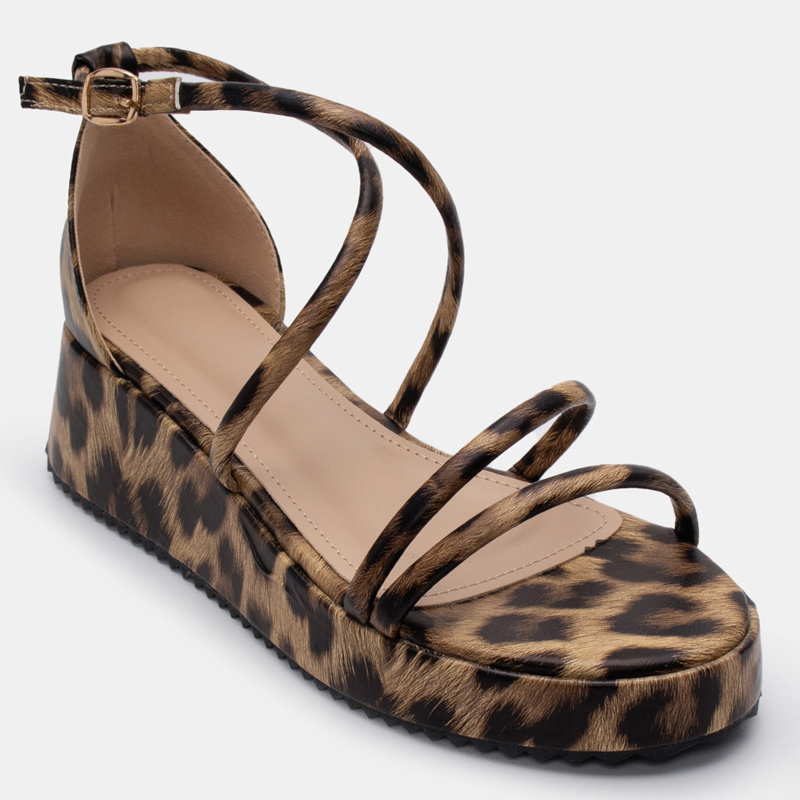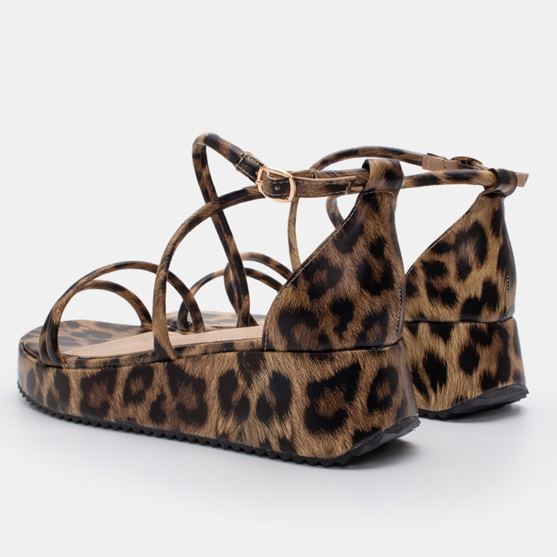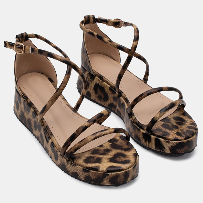 Ύψος σόλας: 5cm Υλικό:Οικολογικό δέρμα Χρώμα:Λεοπάρ Κλείσιμο με ρυθμιζόμενο λουράκι στον αστράγγαλο Λεπτά λουράκια Ανάλαφρο πάτημα