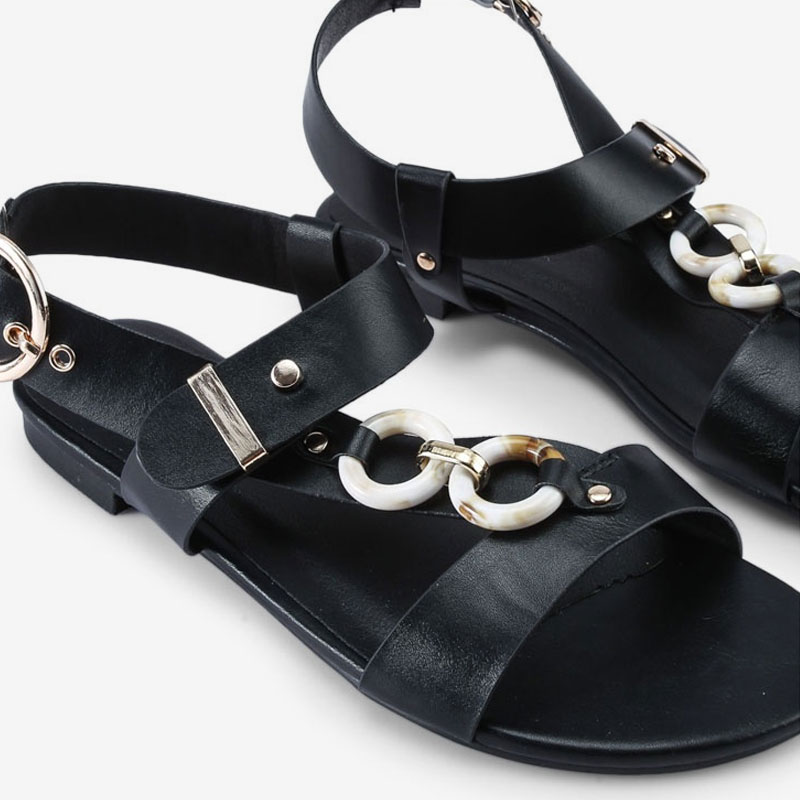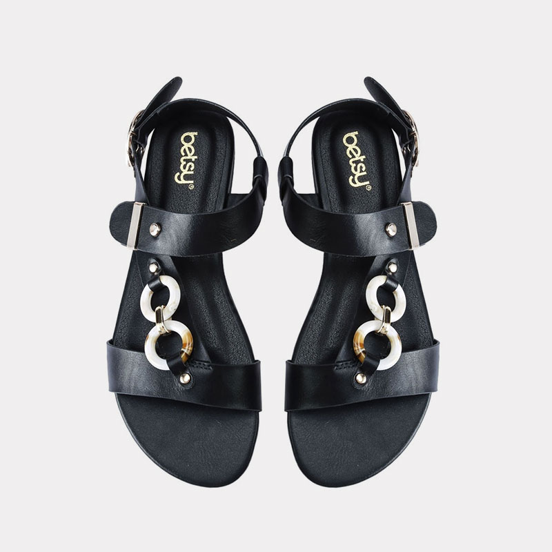 Ίσιο μαύρο σανδάλι από την Βρετανική εταιρεία Betsy. Διαθέτει λεπτά λουράκια με διακοσμητικούς κοκάλινους κρίκους, ενδιάμεση σόλα με επένδυση και ρυθμιζόμενο ιμάντα. Ένα all-day σανδάλι που θα ταιριάξει με όλα σου τα look και θα ενθουσιάσει.