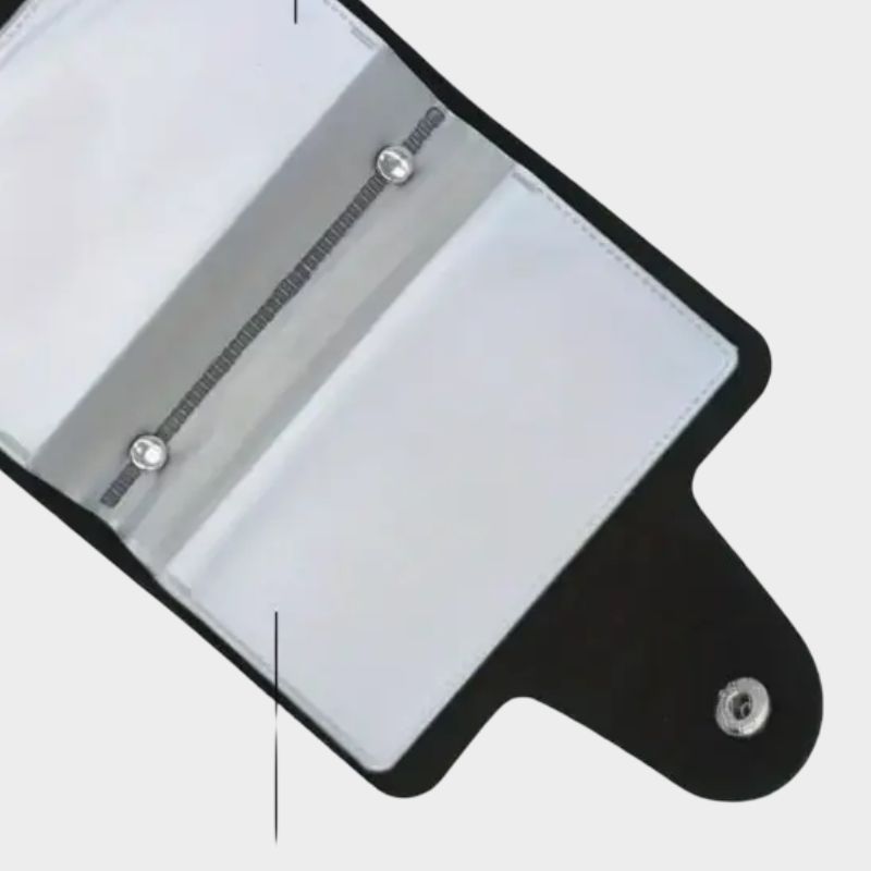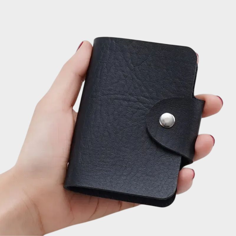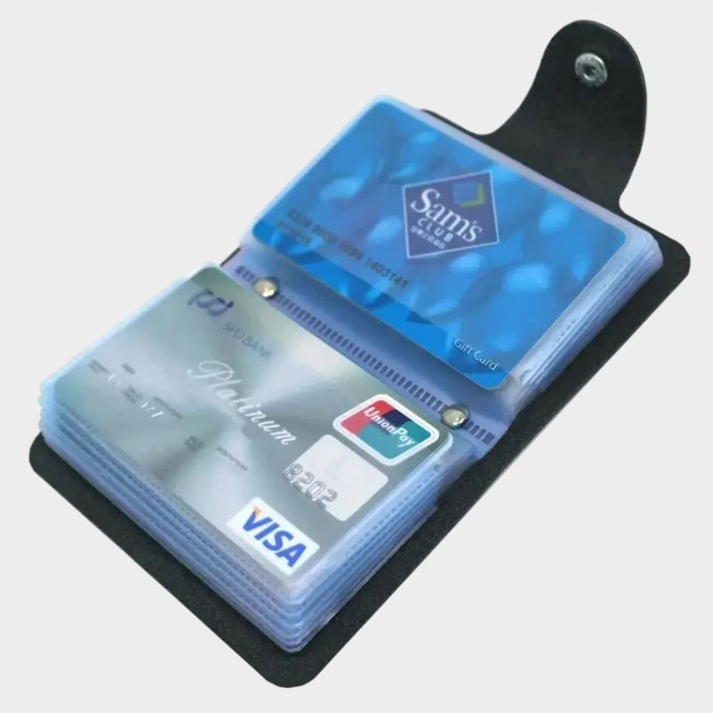Διαστάσεις: 7.5cm x 10cm Υλικό: Συνθετικό δέρμα Κλείσιμο: Κούμπωμα 12 διαφάνειες για κάρτες