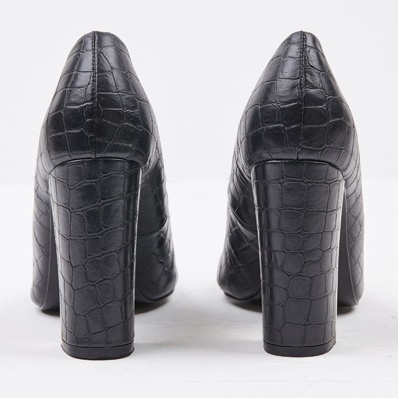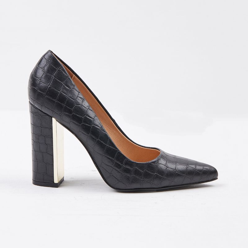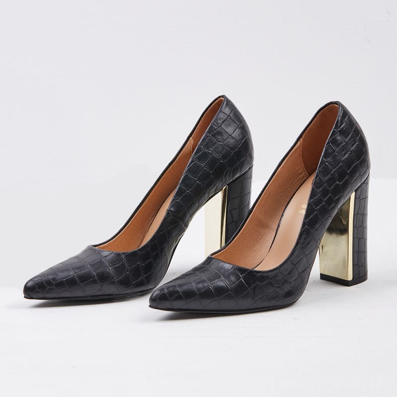 Ιδιαίτερη γόβα με κροκό υφή και χρυσή λεπτομέρεια στο τακούνι της εταιρείας Exe. Ένα άκρως κολακευτικό και διαχρονικό παπούτσι που δεν πρέπει να λείπει από καμία ντουλάπα.