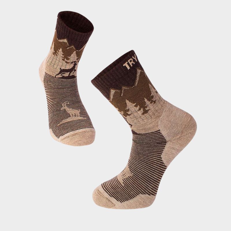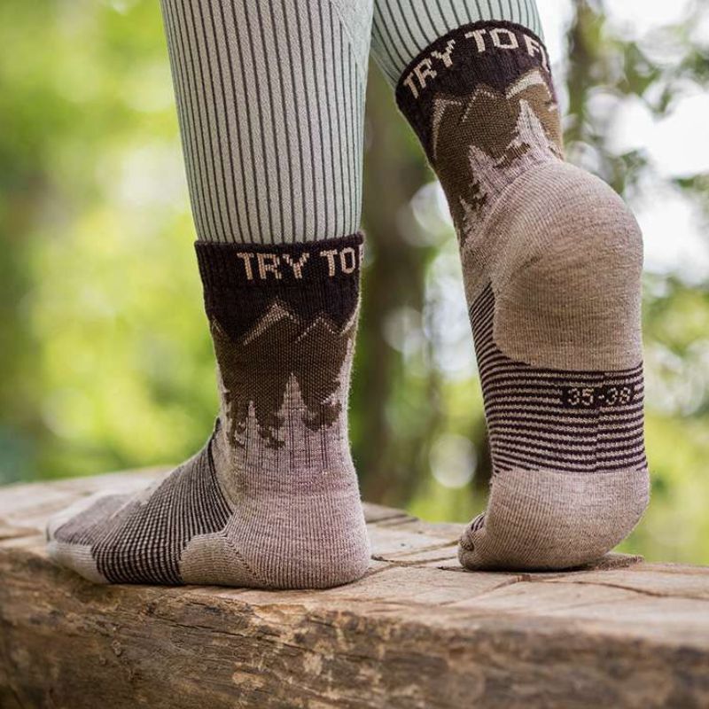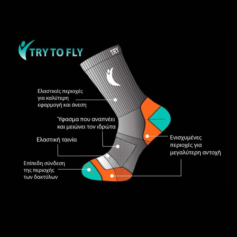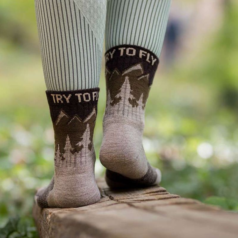 Οι κάλτσες Try to Fly Hiking Socks είναι κατάλληλες για ορεινό τουρισμό και μεγάλες πεζοπορίες. Φτιάχνονται από μαλλί Merino από την Suedwolle (Γερμανία), το οποίο είναι εξαιρετικό θερμομονωτικό και κρατάει τα πόδια δροσερά το καλοκαίρι και ζεστά το χειμώνα. Επιπλέον, το μαλλί Merino έχει αντιβακτηριακές ιδιότητες και μειώνει την εφίδρωση και τις δυσάρεστες οσμές κατά τη χρήση. Οι ζώνες που είναι πιο ευάλωτες κατά τη χρήση έχουν επιπλέον ενίσχυση για καλύτερη αντοχή και άνεση, αποτρέποντας έτσι τη δημιουργία φουσκάλων. Οι ελαστικές ζώνες πάνω από την κάλτσα βοηθούν στην καλύτερη εφαρμογή και αποτρέπουν την κάλτσα από το να γλιστρήσει προς τα κάτω. Η άνεση διασφαλίζεται επίσης με την δεν υπάρχει ραφή στα δάχτυλα. Είναι κατάλληλες για πεζοπορία, τρέξιμο και ποδηλασία σε ανώμαλο έδαφος, καθώς και για δραστηριότητες της καθημερινής ζωής.