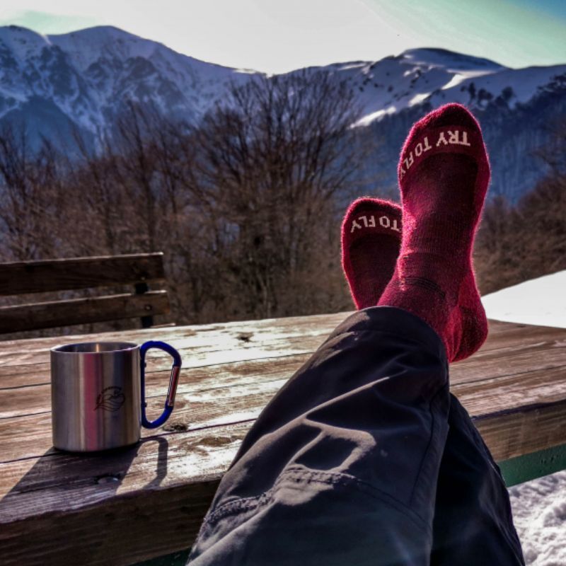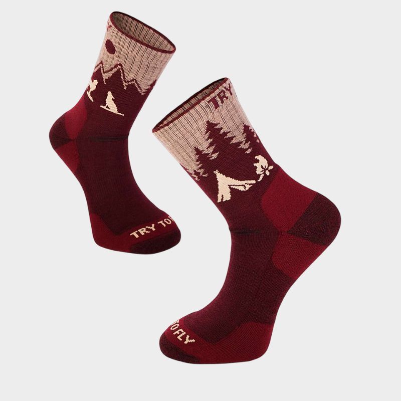 Οι κάλτσες Try to Fly Hiking Socks είναι κατάλληλες για ορεινό τουρισμό και μεγάλες πεζοπορίες. Φτιάχνονται από μαλλί Merino από την Suedwolle (Γερμανία), το οποίο είναι εξαιρετικό θερμομονωτικό και κρατάει τα πόδια δροσερά το καλοκαίρι και ζεστά το χειμώνα. Επιπλέον, το μαλλί Merino έχει αντιβακτηριακές ιδιότητες και μειώνει την εφίδρωση και τις δυσάρεστες οσμές κατά τη χρήση. Οι ζώνες που είναι πιο ευάλωτες κατά τη χρήση έχουν επιπλέον ενίσχυση για καλύτερη αντοχή και άνεση, αποτρέποντας έτσι τη δημιουργία φουσκάλων. Οι ελαστικές ζώνες πάνω από την κάλτσα βοηθούν στην καλύτερη εφαρμογή και αποτρέπουν την κάλτσα από το να γλιστρήσει προς τα κάτω. Η άνεση διασφαλίζεται επίσης με την δεν υπάρχει ραφή στα δάχτυλα. Είναι κατάλληλες για πεζοπορία, τρέξιμο και ποδηλασία σε ανώμαλο έδαφος, καθώς και για δραστηριότητες της καθημερινής ζωής.