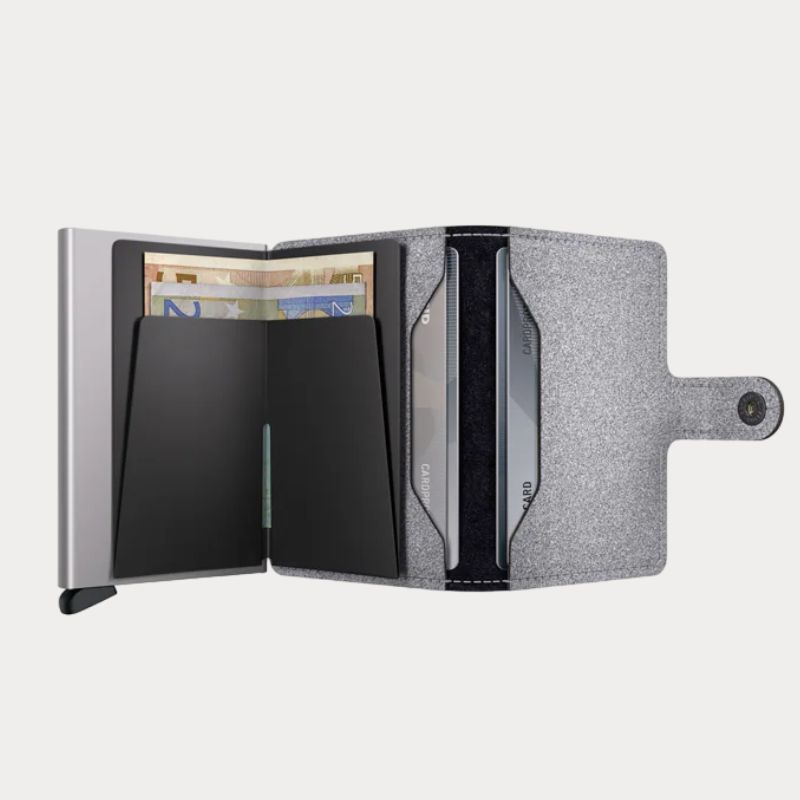 Δερμάτινη Καρτοθήκη πιστωτικών καρτών από την Secrid της σειράς Miniwallet. Η καρτοθήκη έχει προστασία RFID. Έχει πατενταρισμένο μηχανισμό που βγάζει τις κάρτες με μια πολύ απλή κίνηση για γρήγορη πρόσβαση. Το αλουμίνιο προστατεύει τις κάρτες από ανεπιθύμητες ανέπαφες συναλλαγές.