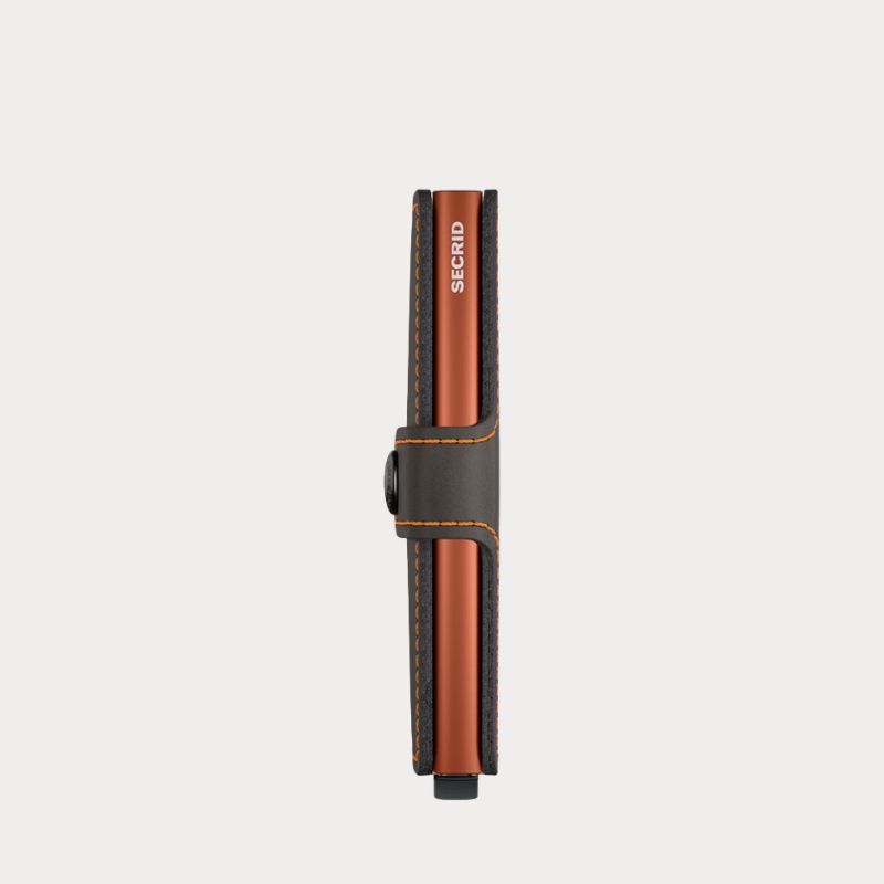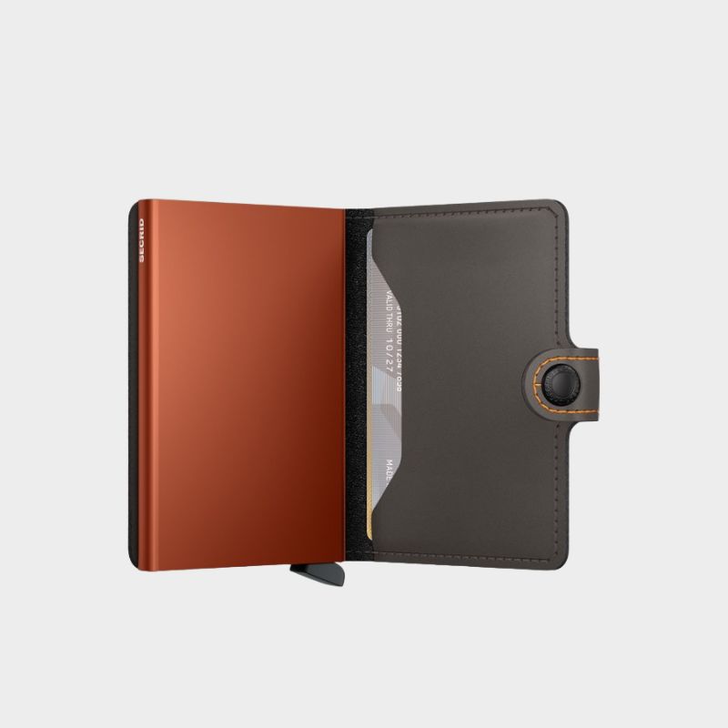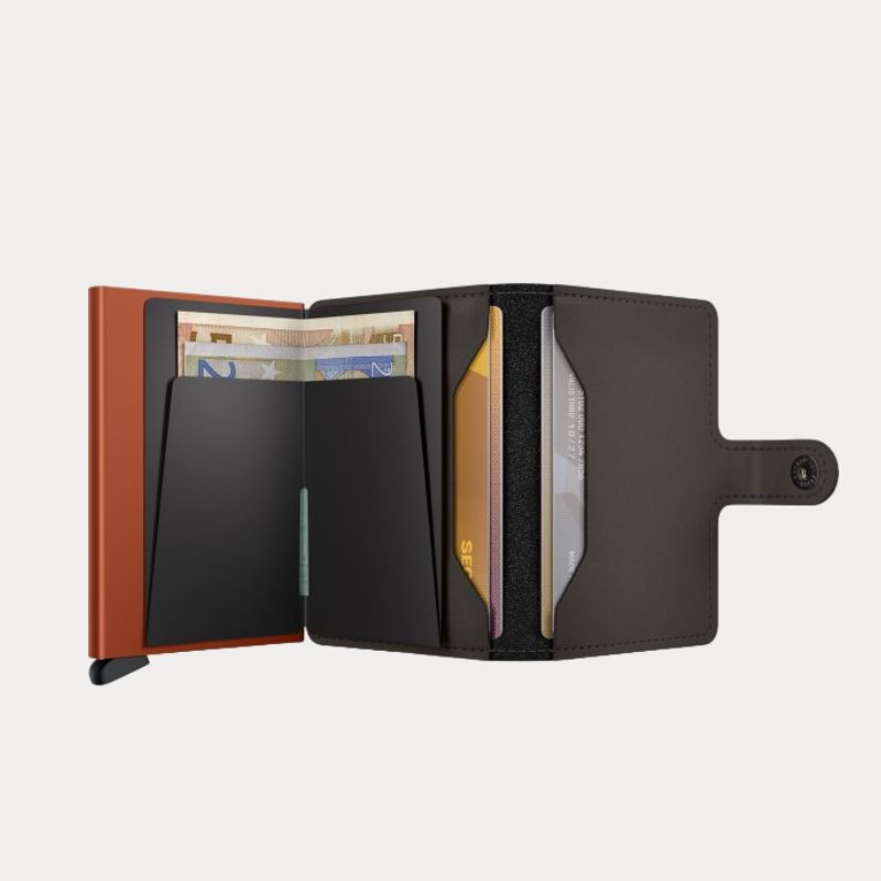 Δερμάτινη Καρτοθήκη πιστωτικών καρτών από την Secrid της σειράς Miniwallet. Η καρτοθήκη έχει προστασία RFID. Έχει πατενταρισμένο μηχανισμό που βγάζει τις κάρτες με μια πολύ απλή κίνηση για γρήγορη πρόσβαση. Το αλουμίνιο προστατεύει τις κάρτες από ανεπιθύμητες ανέπαφες συναλλαγές.