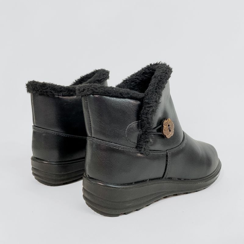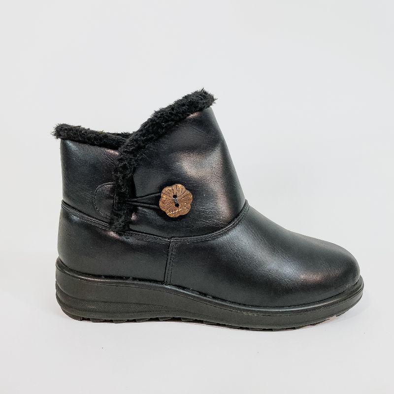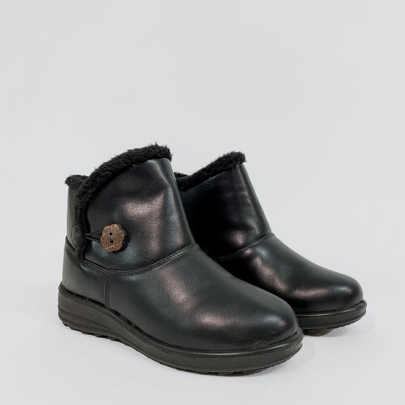 Γυναικείο μποτάκι από οικολογικό δέρμα σε μαύρο χρώμα με εσωτερική επένδυση από οικολογική γούνα για να κρατάει το πόδι σας ζεστό. Διαθέτει μαλακό πάτο και αντιολισθητική σόλα.
