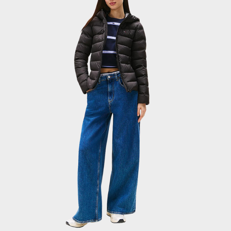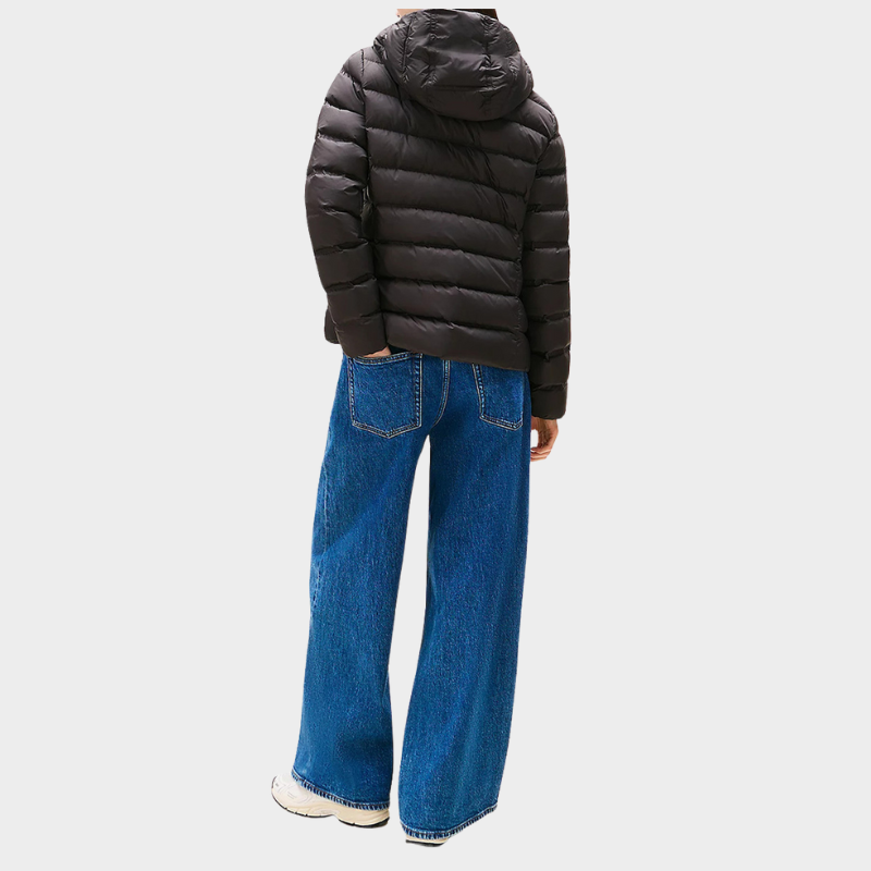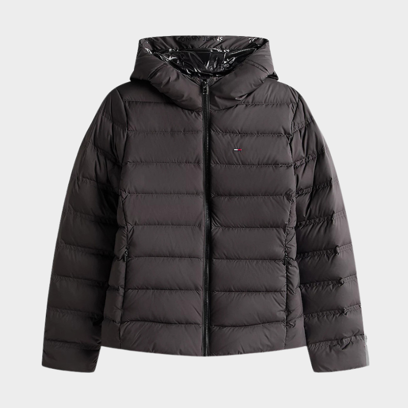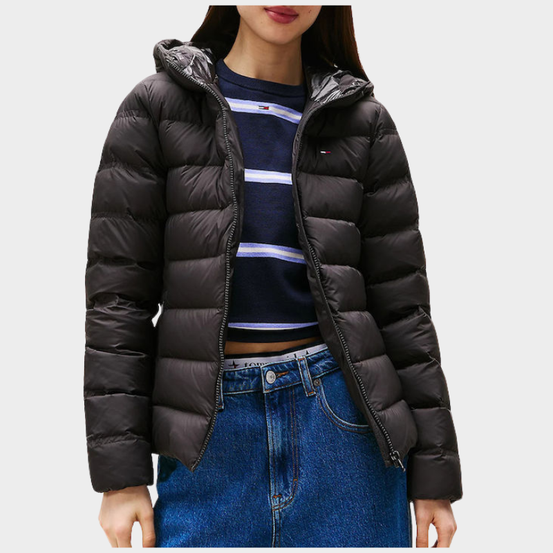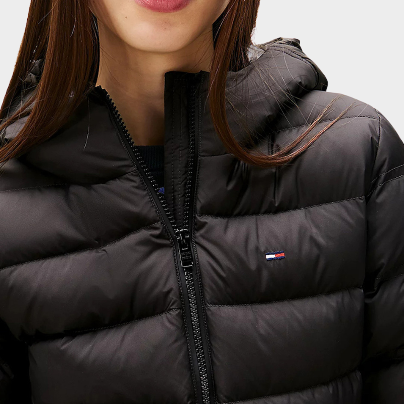 Γυναικείο φουσκωτό μπουφάν, αδιάβροχο, εφαρμοστό, με καπιτονέ σχέδιο, κουκούλα, εσωτερικό γέμισμα με φτερά και κλείσιμο με φερμουάρ.