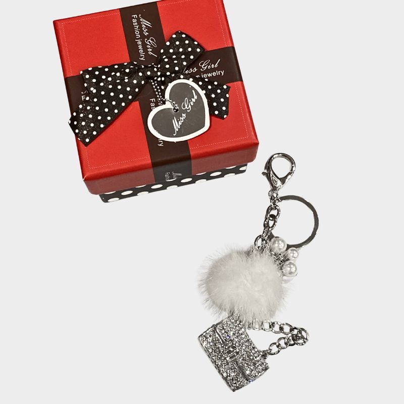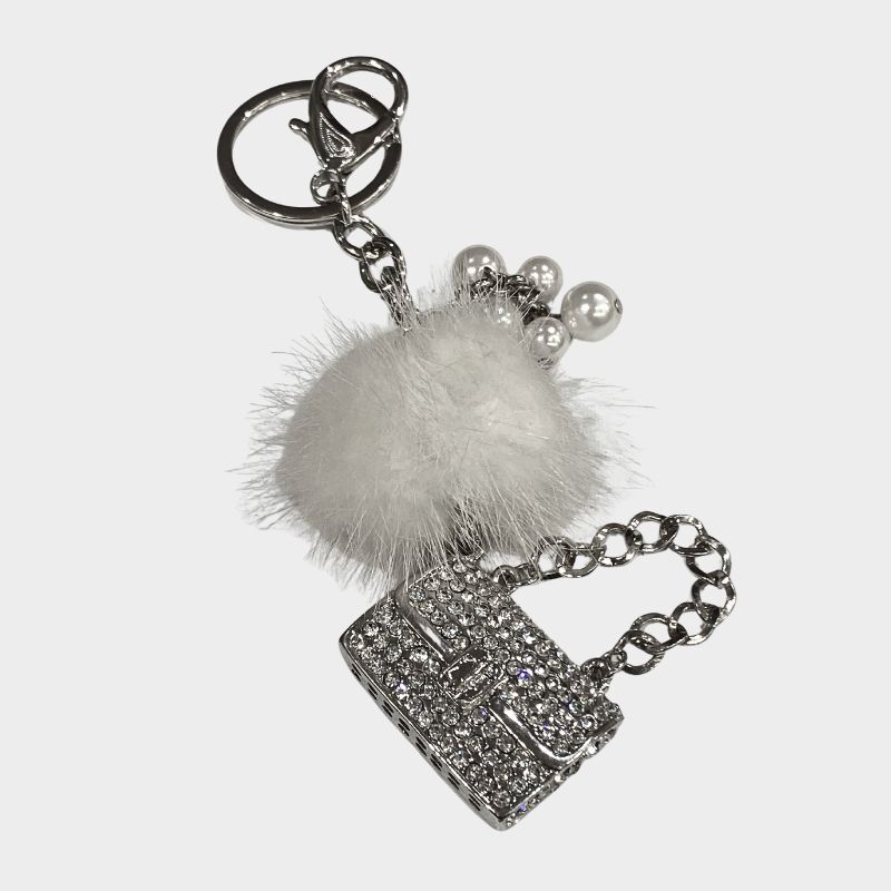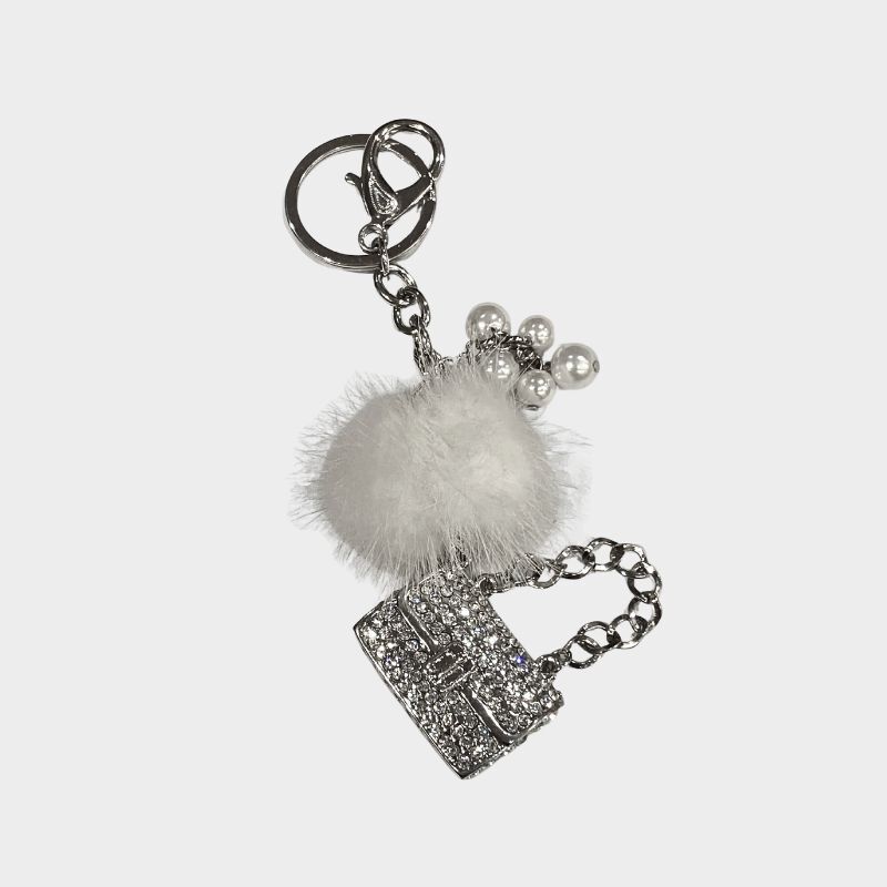 Αναβάθμισε το στυλ σου με αυτό το εντυπωσιακό μπρελόκ με λευκή φουντίτσα, διακοσμητικές πέρλες και τσαντάκι γεμάτο λαμπερά στρας. Ιδανικό για να προσθέσεις μια πινελιά κομψότητας στην τσάντα, τα κλειδιά ή ακόμα και στο πορτοφόλι σου.
