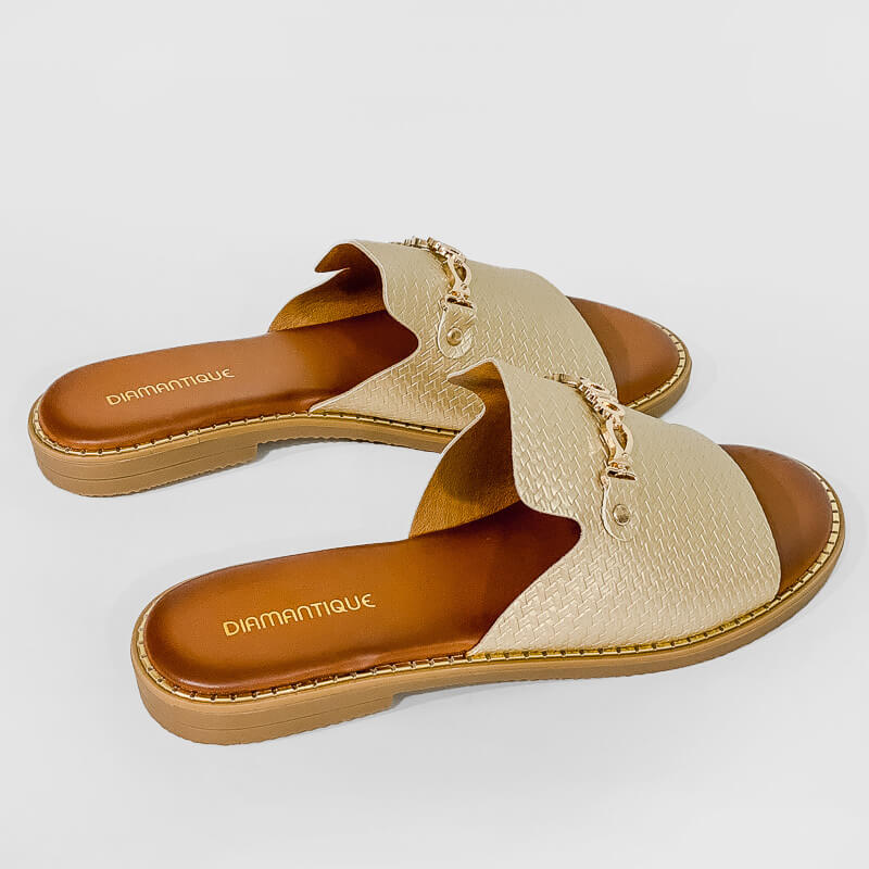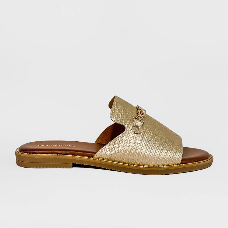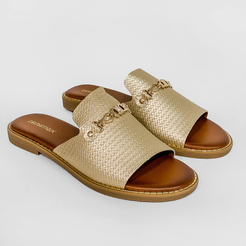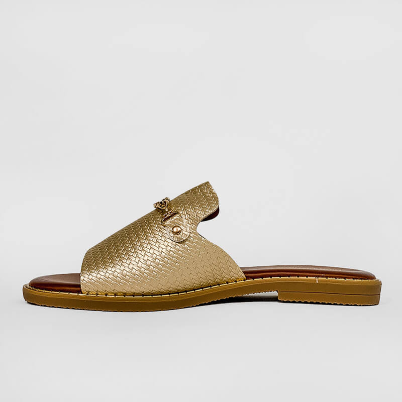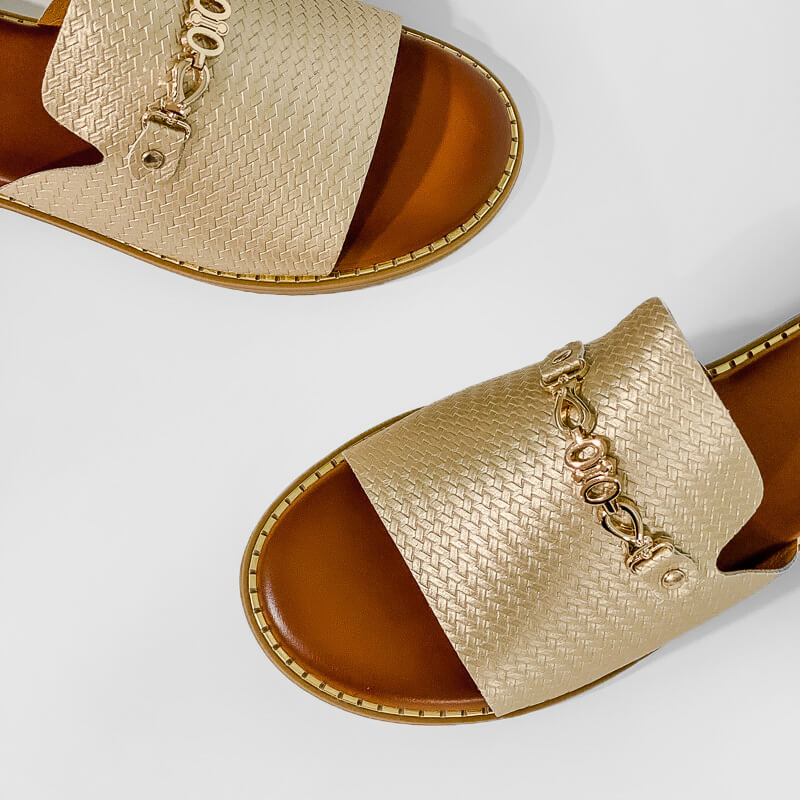 Γυναικείες παντόφλες με διακοσμητική αγκράφα και φάσα με εφέ πλέξης. Διαθέτουν ελαφρύ πάτημα και στρογγυλή μύτη. Είναι κατασκευασμένες από οικολογικό δέρμα. Προσαρμόζονται στη φόρμα του ποδιού και παρέχουν επιπλέον άνεση χάρις την μαλακή επένδυση στο πέλμα