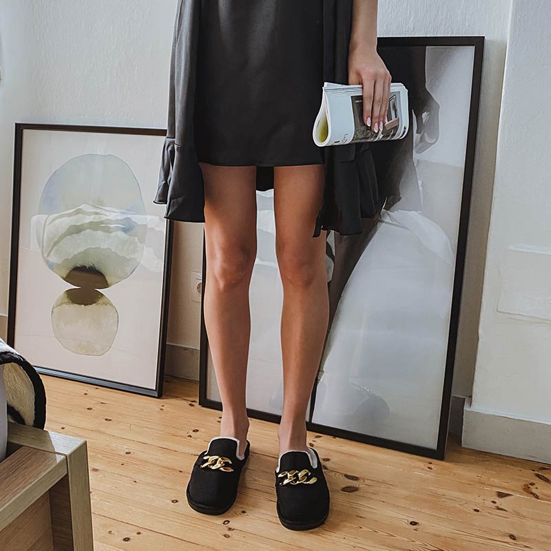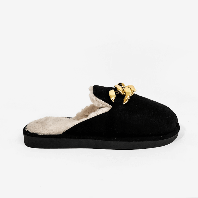 Γυναικεία παντόφλα σπιτιού που διαθέτει μαλακό πάτο, επένδυση από οικολογική γούνα και μία χρυσή διακοσμητική αλυσίδα στο πάνω μέρος. Μία παντόφλα που θα σας προσφέρει άνεση και ζεστασιά.