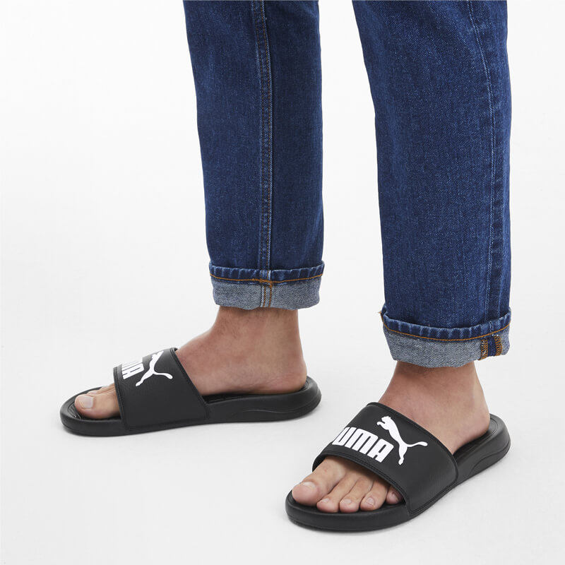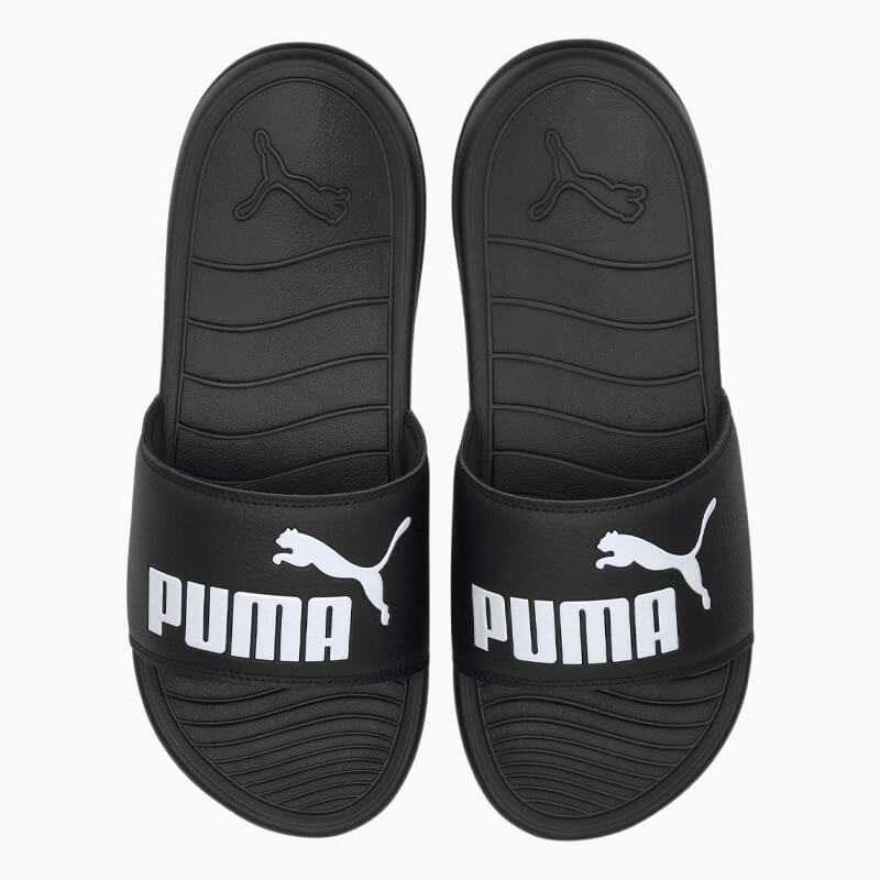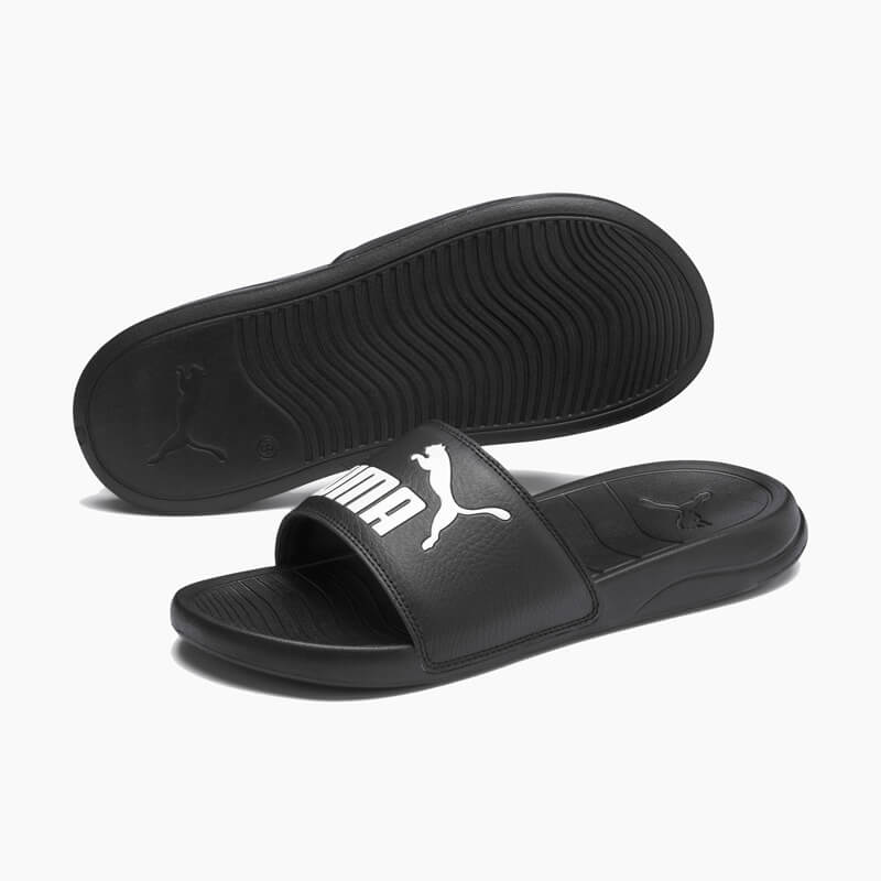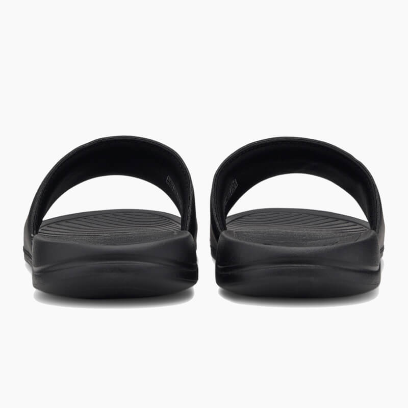 Παντόφλα Puma από οικολογικό δέρμα σε μαύρο χρώμα και εξωτερική σόλα ΕVA για μέγιστη απορρόφηση των κραδασμών.