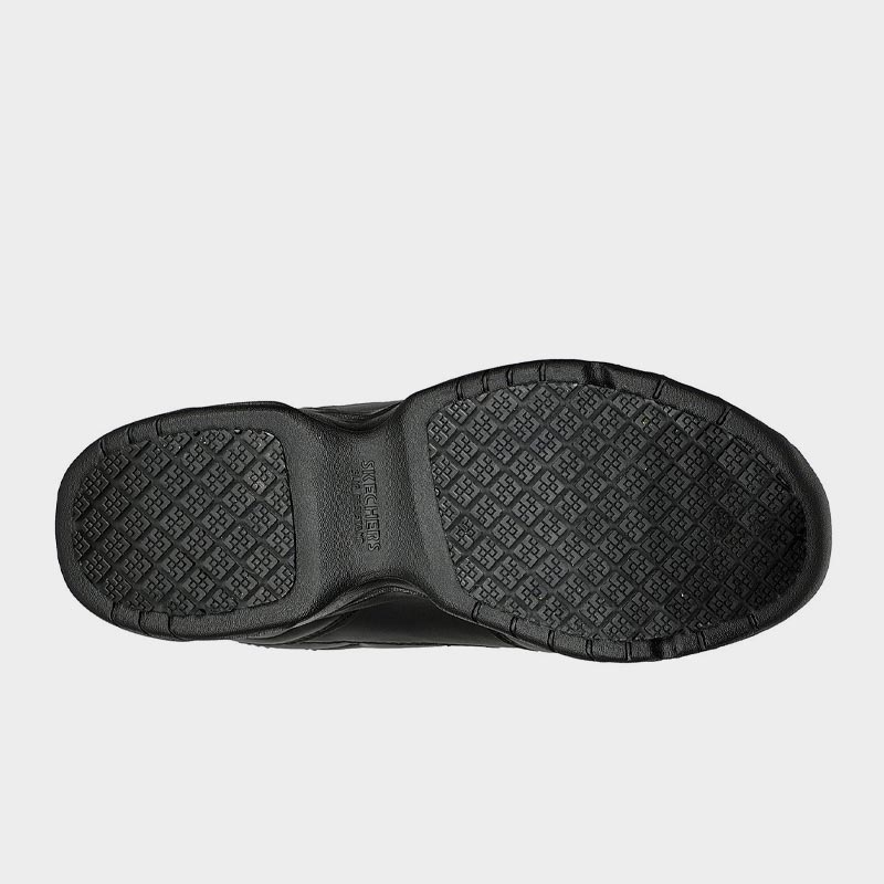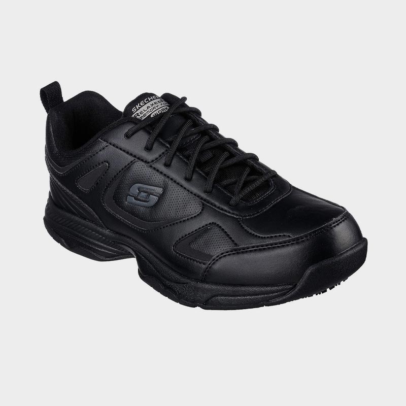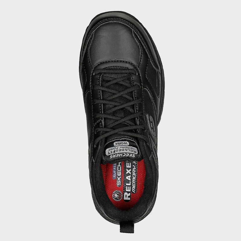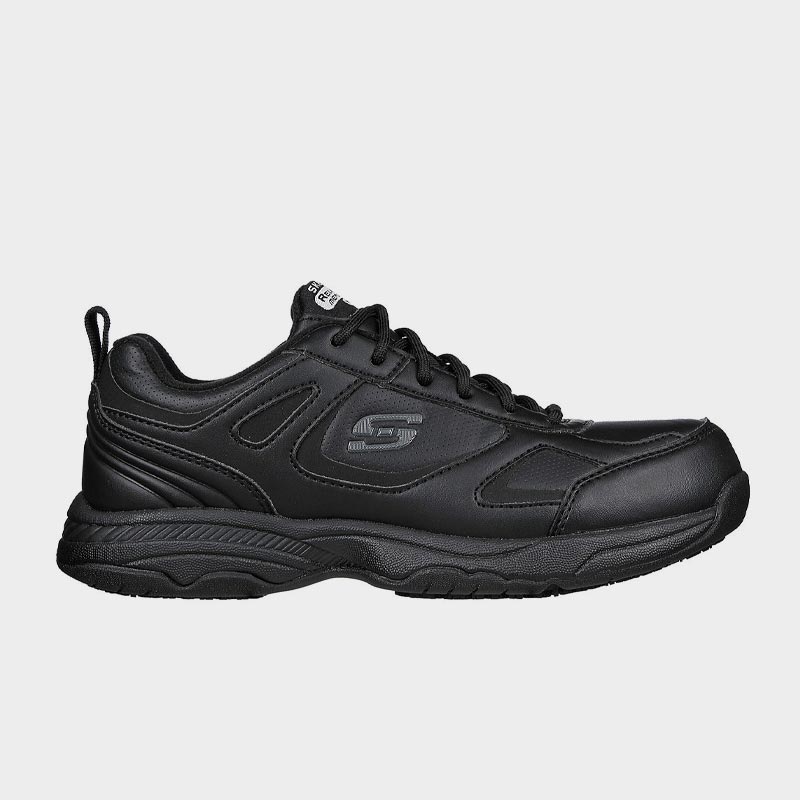 Παπούτσι εργασίας της Skechers με άνω μέρος από οικολογικό δέρμα σε μαύρο χρώμα. Διαθέτει μαλακό εσωτερικό πάτο Skechers Memory Foam™ με αντικραδασμική προστασία και εύκαμπτη, ελαφριά ενδιάμεση σόλα με αντικραδασμική δράση. Ένα παπούτσι εργασίας που θα σας προσφέρουν άνεση και ασφάλεια.