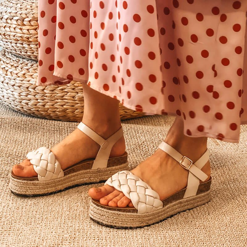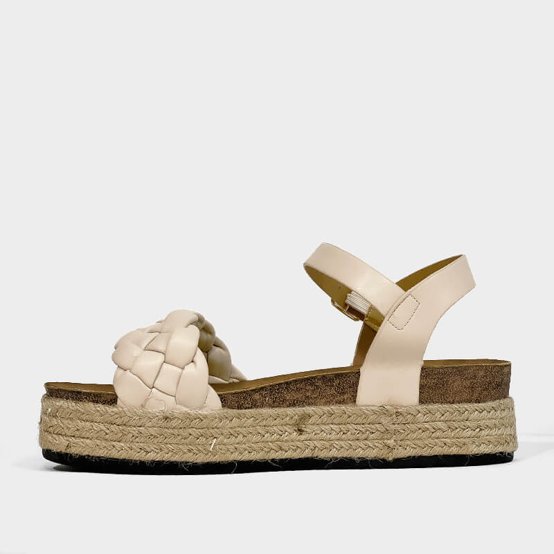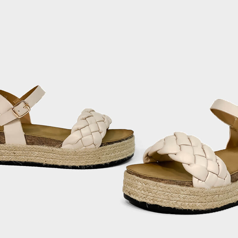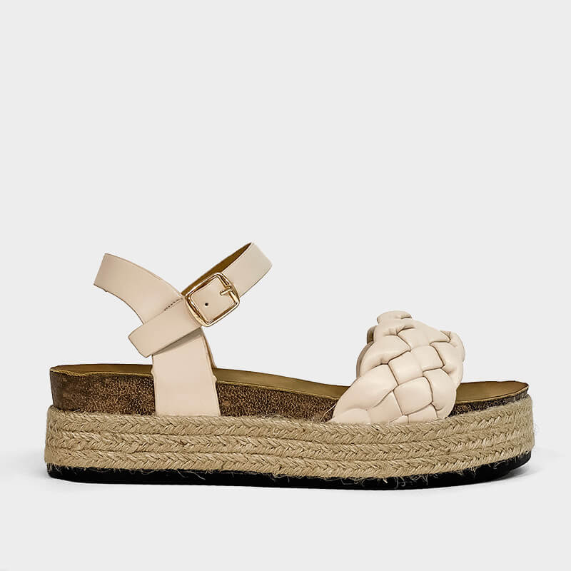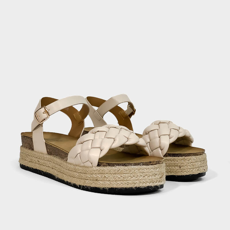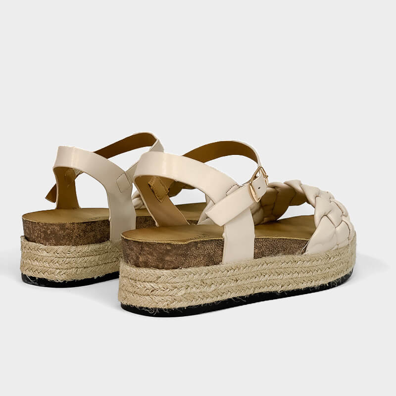 Γυναικείες πλατφόρμες με πλεκτή φάσα στο μπροστινό μέρος και λουράκι που δένει γύρω από τον αστράγαλο. Διαθέτουν επένδυση από ψάθα στο κάτω μέρος και αντιολισθητική σόλα. Είναι κατασκευασμένες από οικολογικό δέρμα.