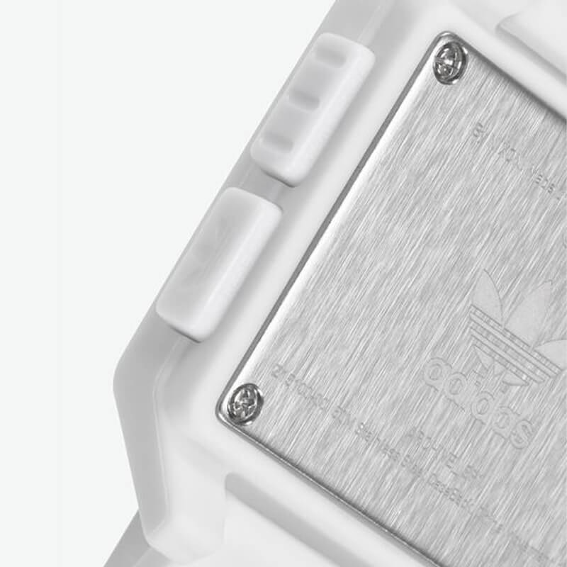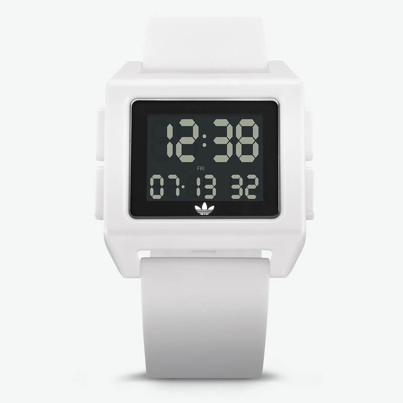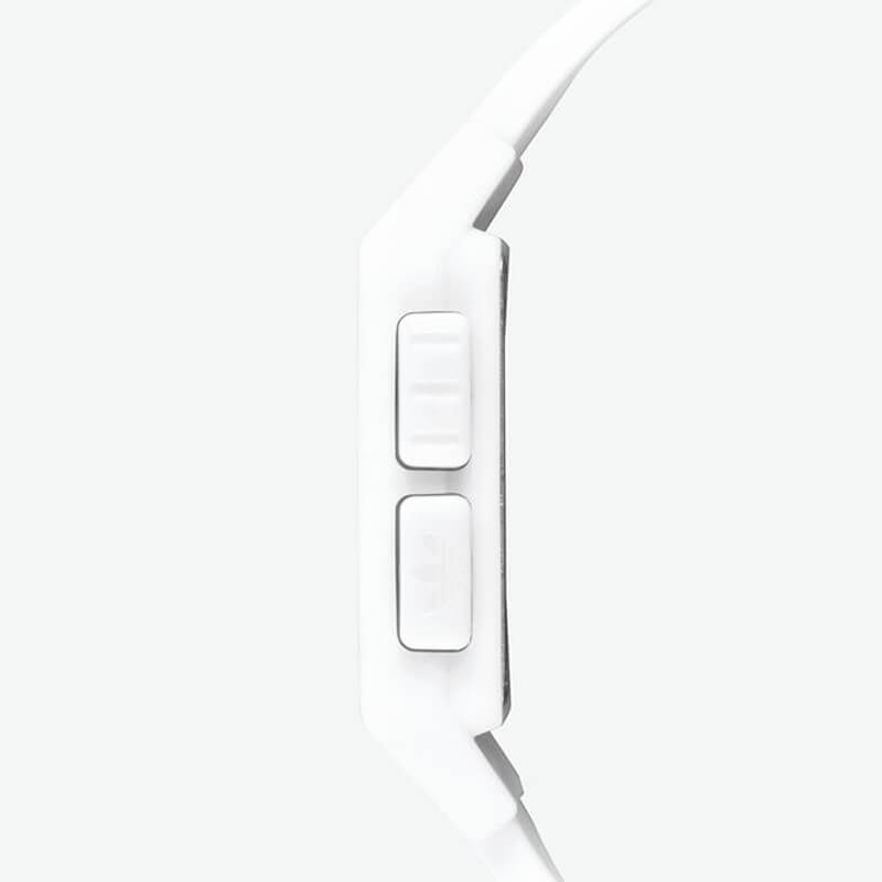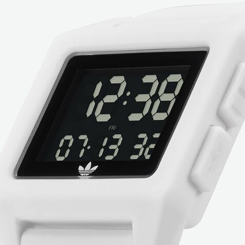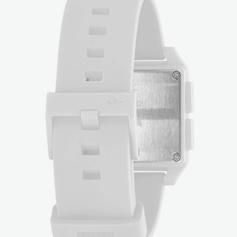 Ρολόι της Adidas με λουράκι από λευκό καουτσούκ. Έχει ψηφιακό μηχανισμό και κούμπωμα τοκάς.