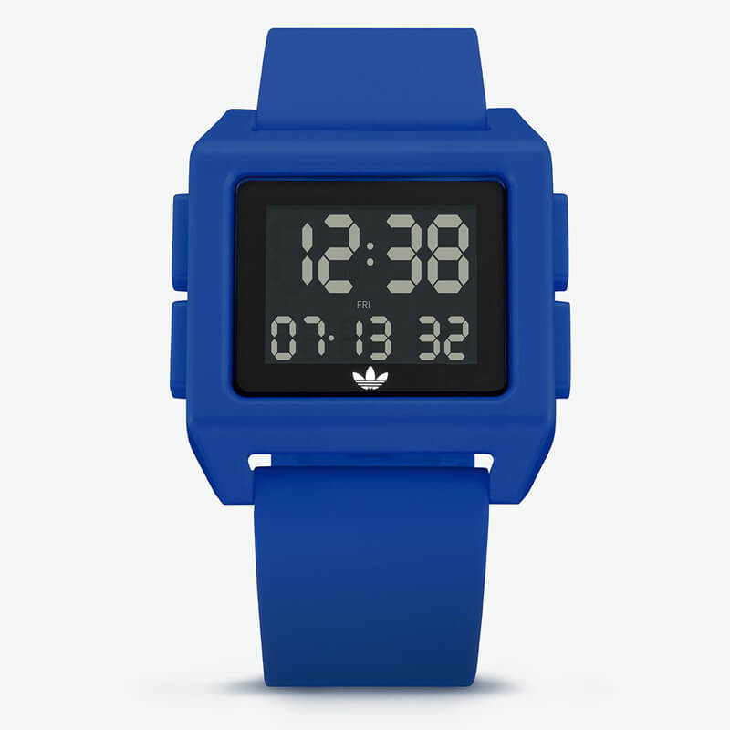 Ρολόι της Adidas με λουράκι από μπλε καουτσούκ. Έχει ψηφιακό μηχανισμό και κούμπωμα τοκάς.