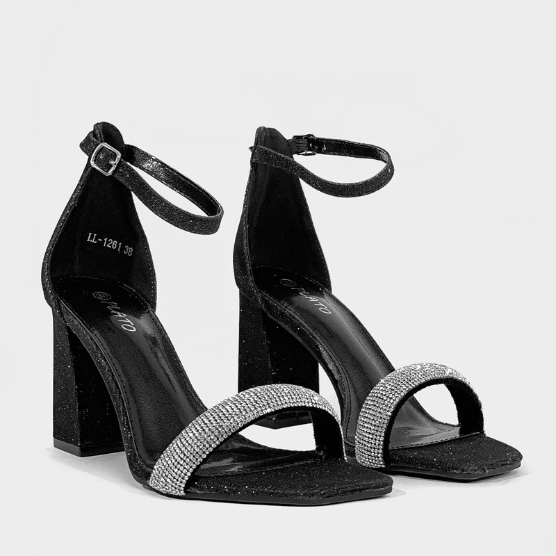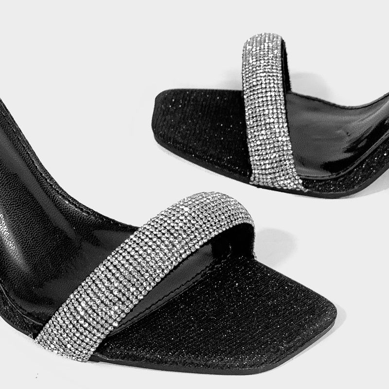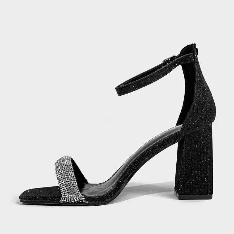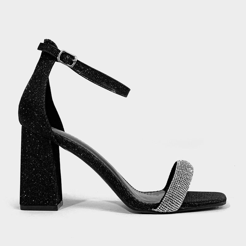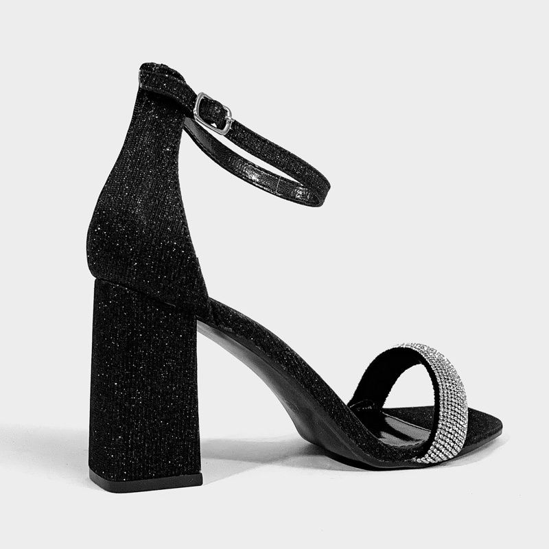 Πέδιλα με ψηλό τακούνι, διακοσμητικά στρας και glitter για περισσότερη λάμψη. Μία κομψή επιλογή που θα σας προσφέρει άνεση και στυλ σε κάθε έξοδο.