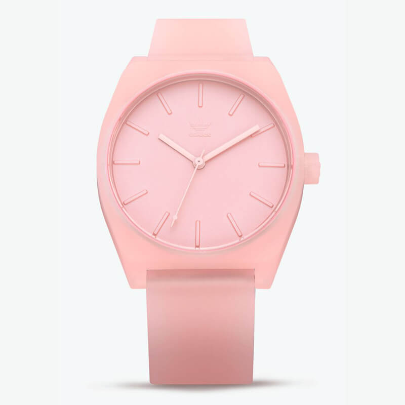 Ρολόι της Adidas από ροζ πολυκαρμπονική κάσα. Έχει μηχανισμό μπαταρίας και κανονικό κούμπωμα.