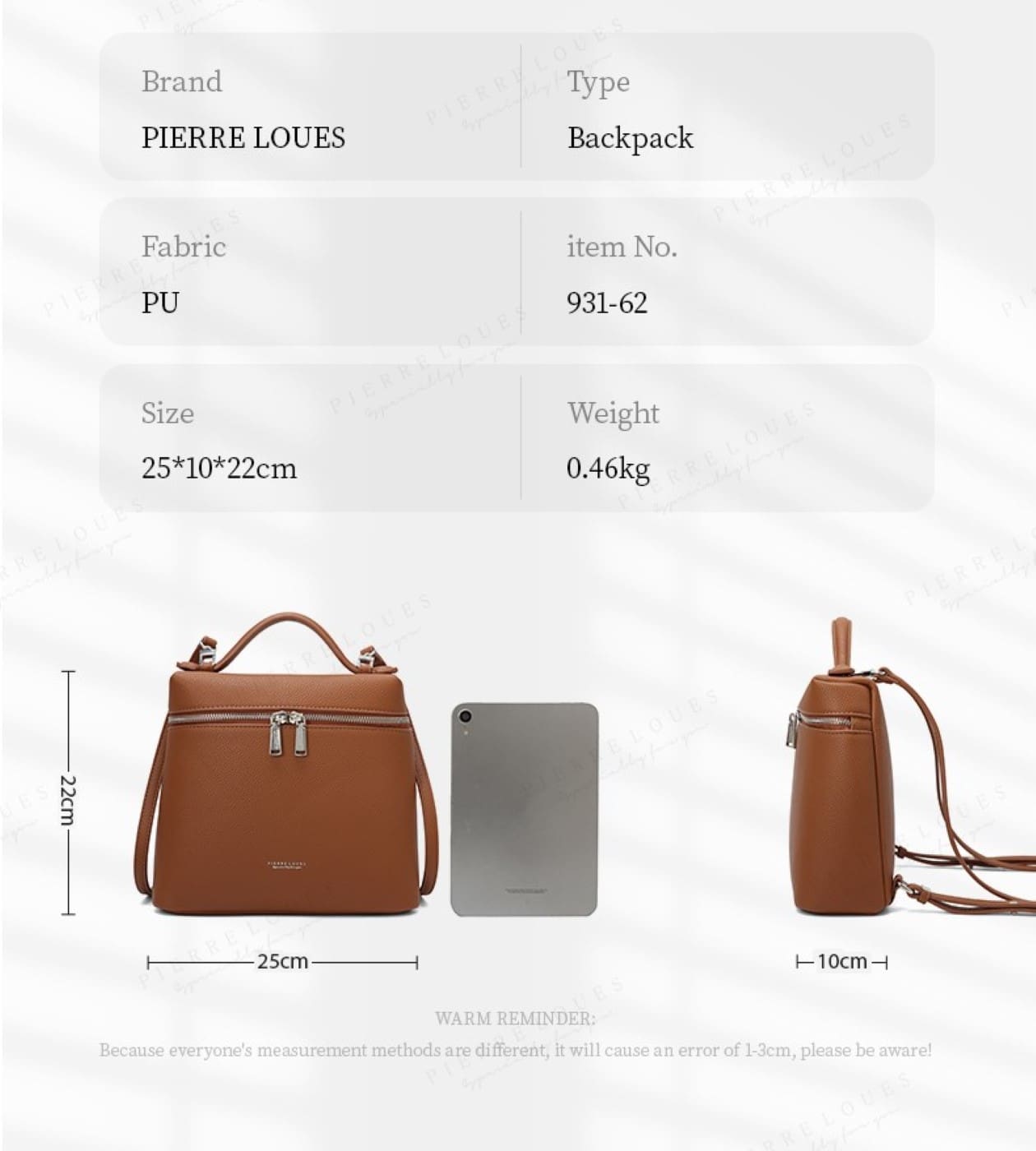 – Δομή – Το γυναικείο σακίδιο Pierre Loues διαθέτει 1 κύρια θήκη με φερμουάρ , εσωτερική τσέπη με φερμουάρ καλύπτοντας τις ανάγκες σας για καθημερινές δραστηριότητες. Το ευρύχωρο εσωτερικό μπορεί να χωρέσει το κραγιόν, το κινητό, τα πορτοφόλια, τα κλειδιά, τα καλλυντικά κ.λπ.