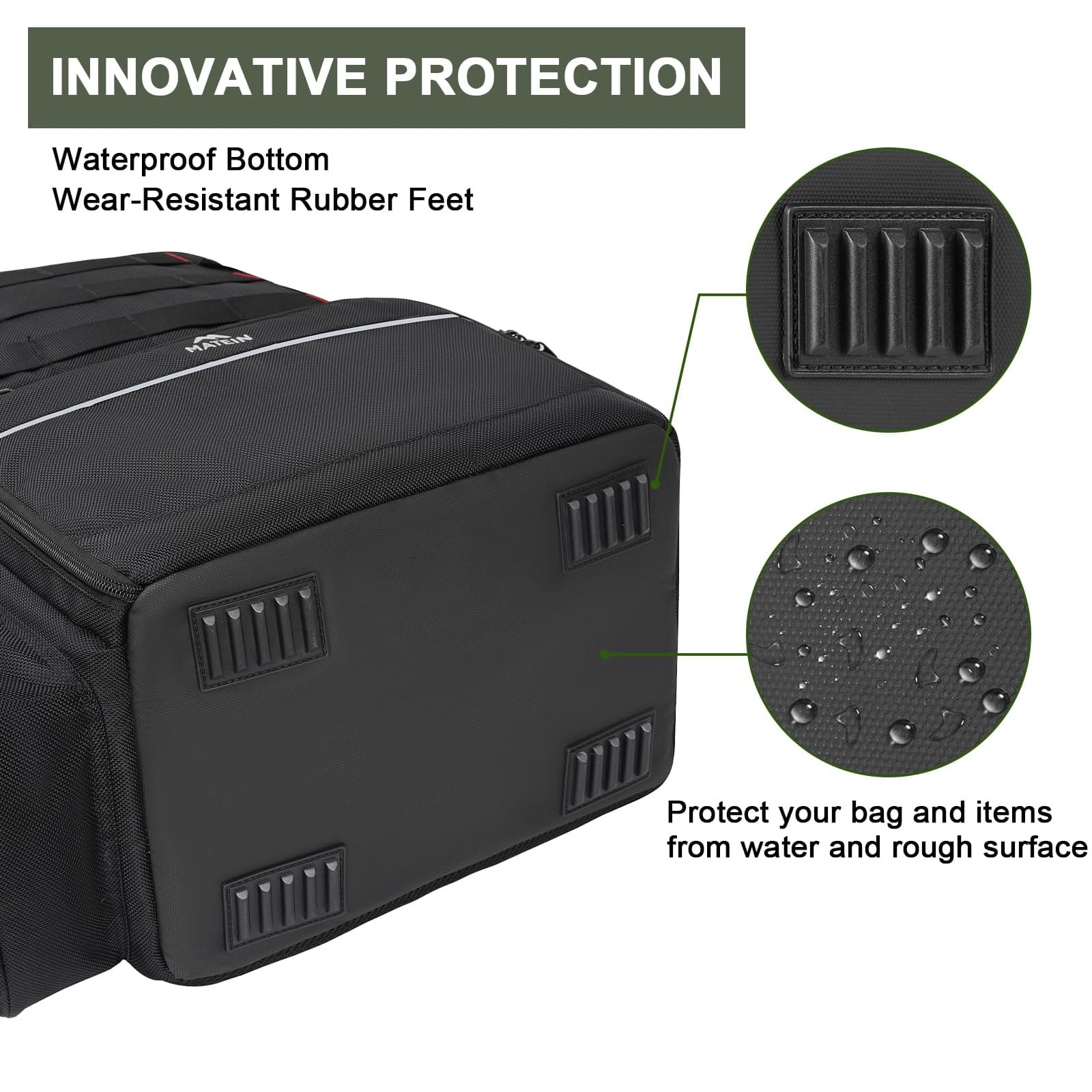 -Ανθεκτικό στο αλμυρό νερό-: Το σακίδιο πλάτης είναι κατασκευασμένο από ανθεκτικά premium νάιλον υφάσματα που είναι εξαιρετικά ανθεκτικά στο νερό. Σε συνδυασμό με αντισκωριακό φερμουάρ από κράμα ψευδαργύρου, η μοναδική του αντοχή στο αλμυρό νερό το καθιστά ιδανικό για ψάρεμα. Το κάτω μέρος είναι καλυμμένο με πλήρως αδιάβροχα σύνθετα υλικά, συν 4 αντιολισθητικά πόδια από καουτσούκ που κρατούν την τσάντα σας ασφαλή από τη σύγκρουση και πιο ανθεκτική στη σκληρή επιφάνεια .