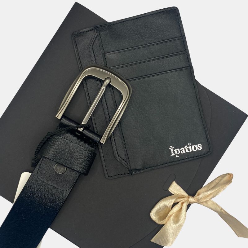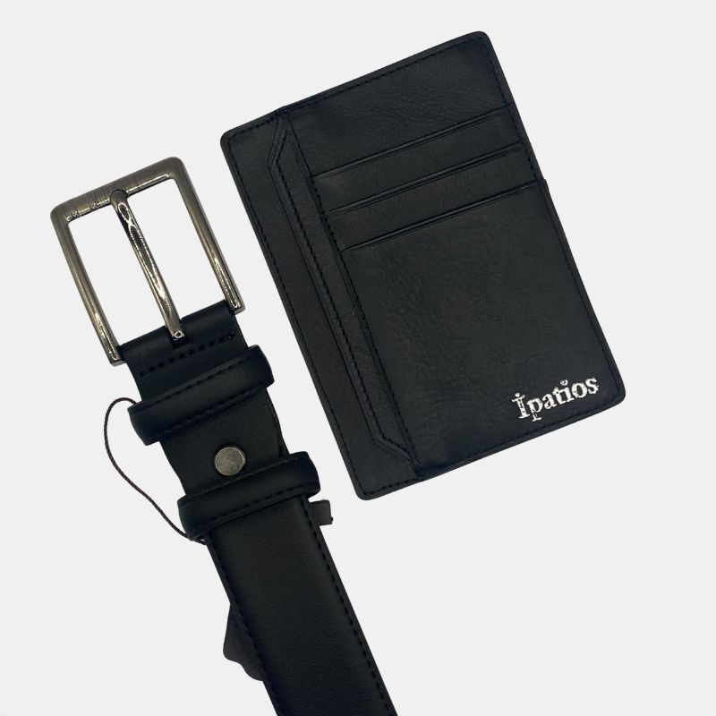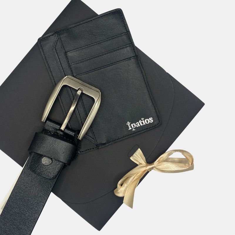 Δερμάτινο σετ δώρου που αποτελείτε από ένα δερμάτινο πορτοφόλι και μία δερμάτινη ζώνη σε μαύρο χρώμα.