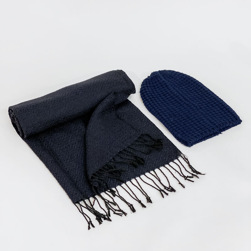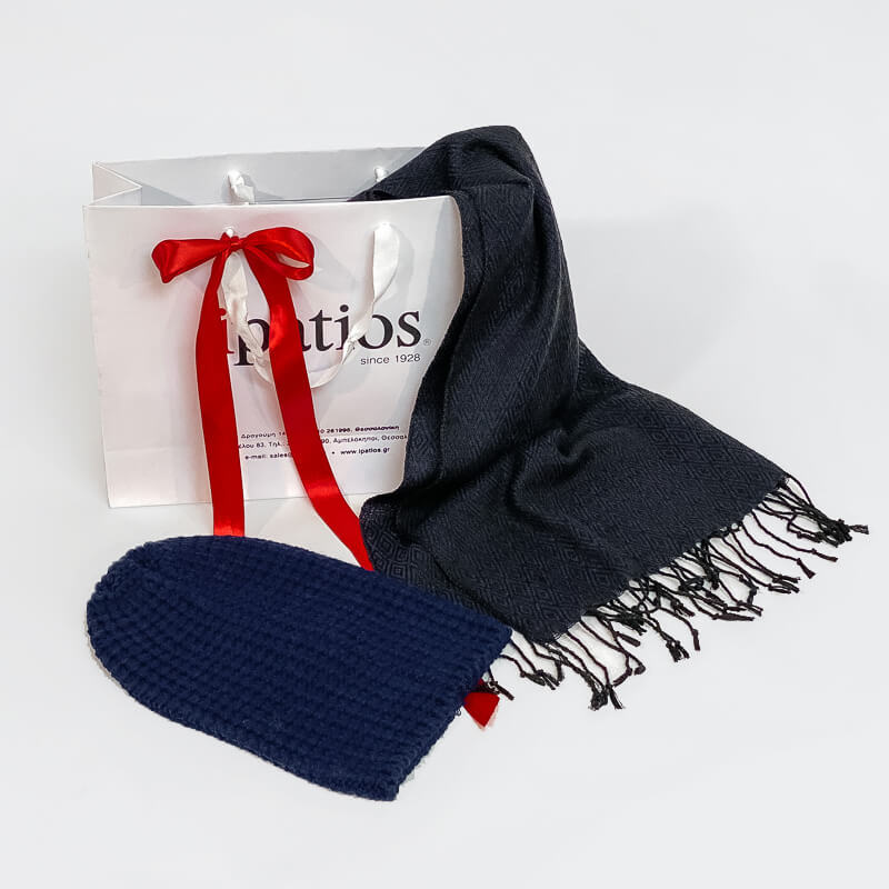 Γυναικείο σετ δώρου Pierre Cardin που περιλαμβάνει σκουφάκι σε μπλε χρώμα και απαλή πασμίνα με σχέδιο ρόμβους που προσφέρει άνεση και ζεστασιά σε κάθε σας έξοδο.