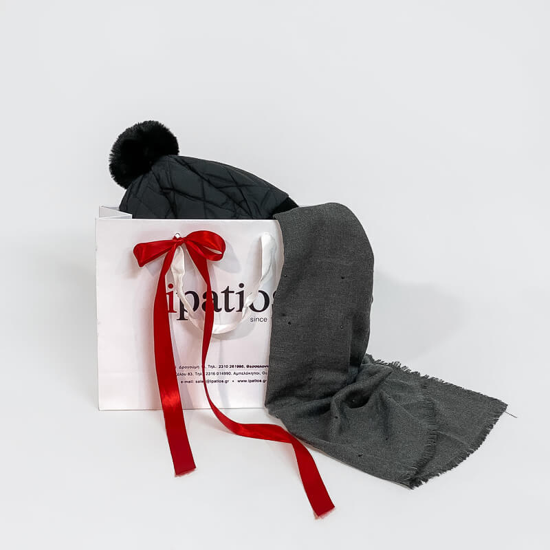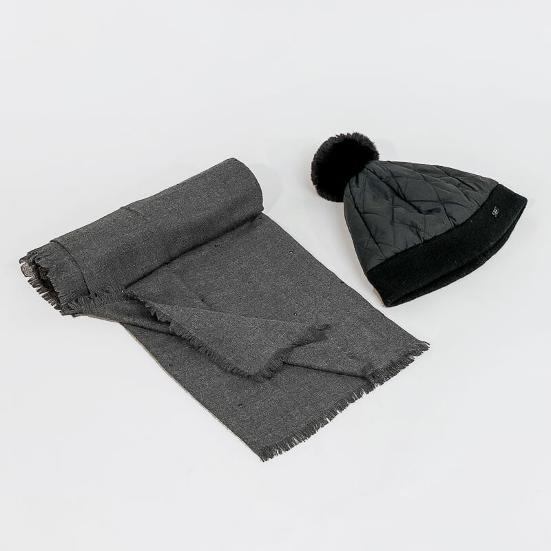 Γυναικείο σετ δώρου Pierre Cardin που περιλαμβάνει σκουφάκι με γουνάκι και καπιτονέ σχέδιο μαύρο χρώμα που έχει βαμβακερή εσωτερική επένδυση για να κρατάει το κεφάλι σας ζεστό και απαλή πασμίνα με στρας.